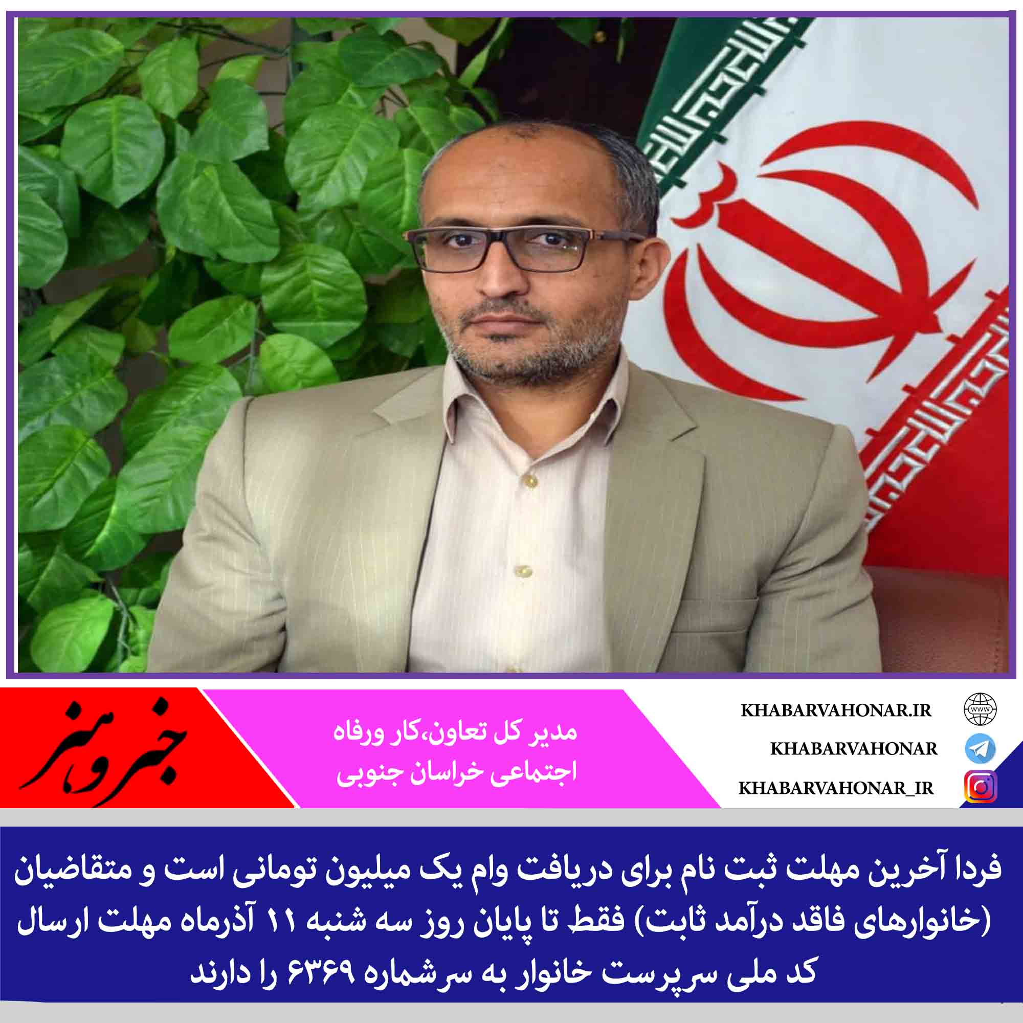 ?غلامرضا اشرفی. مدیر کل تعاون،کار ورفاه اجتماعی خراسان جنوبی. گفت فردا آخرین مهلت ثبت نام برای دریافت وام یک میلیون تومانی است و متقاضیان (خانوارهای فاقد درآمد ثابت) فقط تا پایان روز سه شنبه ۱۱ آذرماه مهلت ارسال کد ملی سرپرست خانوار به سرشماره ۶۳۶۹ را دارند.