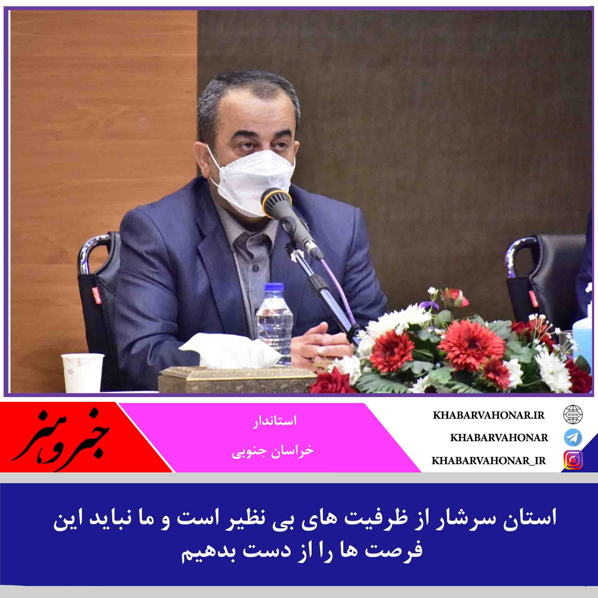 ?استاندار خراسان جنوبی گفت: استان سرشار از ظرفیت های بی نظیر است و ما نباید این فرصت ها را از دست بدهیم.
