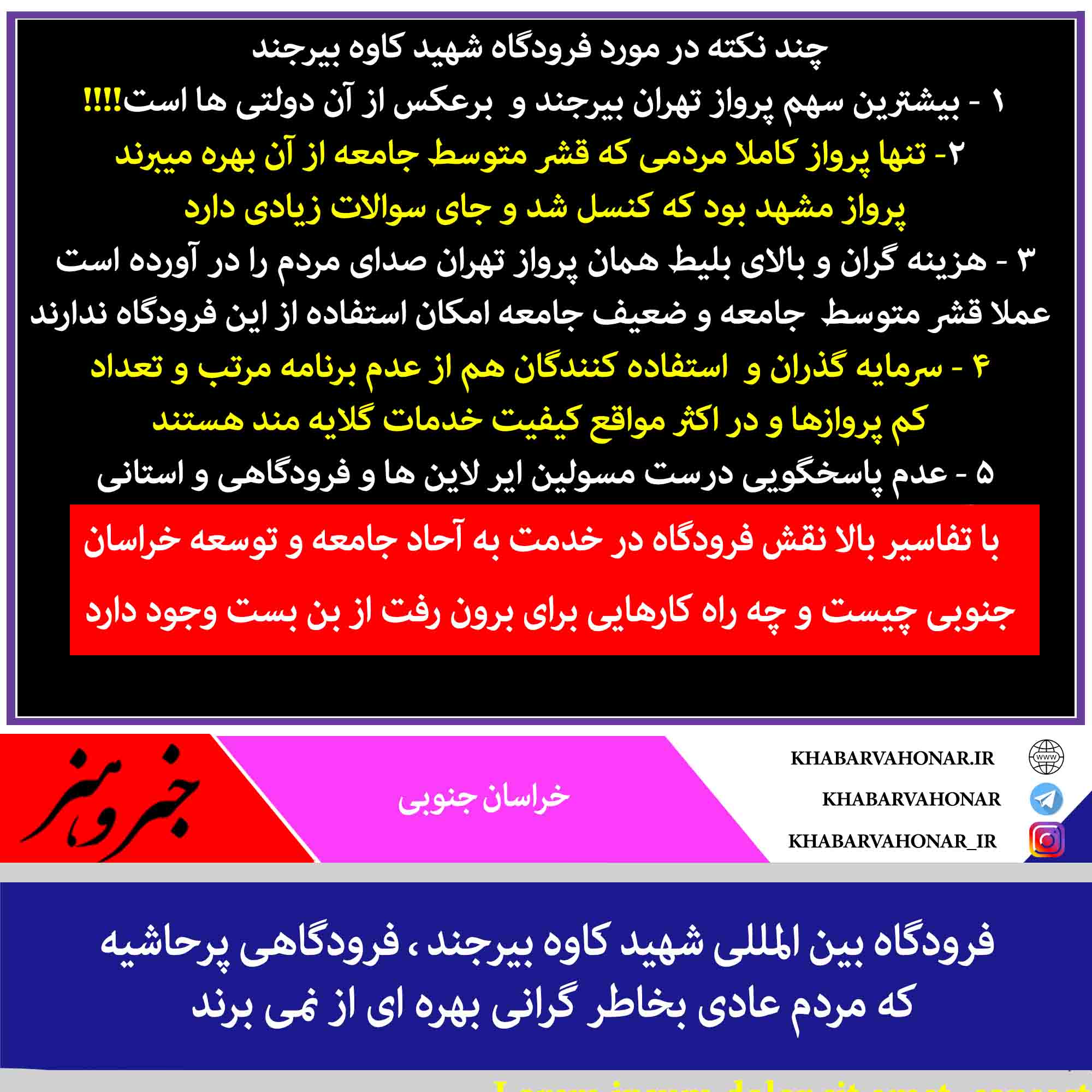 چند نکته در مورد فرودگاه شهید کاوه بیرجند ۱ – بیشترین سهم پرواز تهران بیرجند و برعکس از آن دولتی ها است!!!! ۲- تنها پرواز کاملا مردمی که قشر متوسط جامعه از آن بهره میبرند پرواز مشهد بود که کنسل شد و جای سوالات زیادی دارد ۳ – هزینه گران و بالای بلیط همان پرواز تهران صدای مردم را در آورده است عملا قشر متوسط جامعه و ضعیف جامعه امکان استفاده از این فرودگاه ندارند ۴ – سرمایه گذران و استفاده کنندگان هم از عدم برنامه مرتب و تعداد کم پروازها و در اکثر مواقع کیفیت خدمات گلایه مند هستند ۵ – عدم پاسخگویی درست مسولین ایر لاین ها و فرودگاهی و استانی
