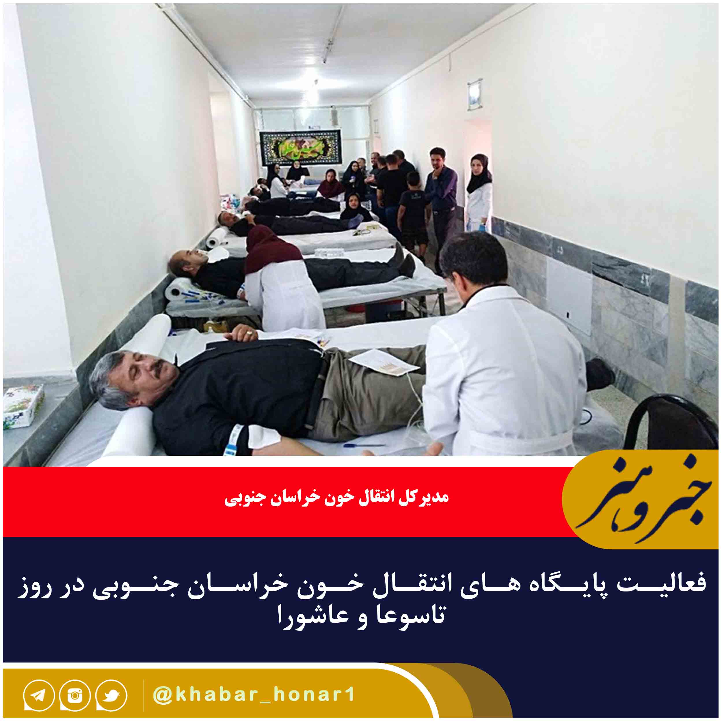 مدیرکل انتقال خون خراسان جنوبی از فعالیت پایگاه های انتقال خون استان در روز تاسوعا و عاشورا خبر داد.