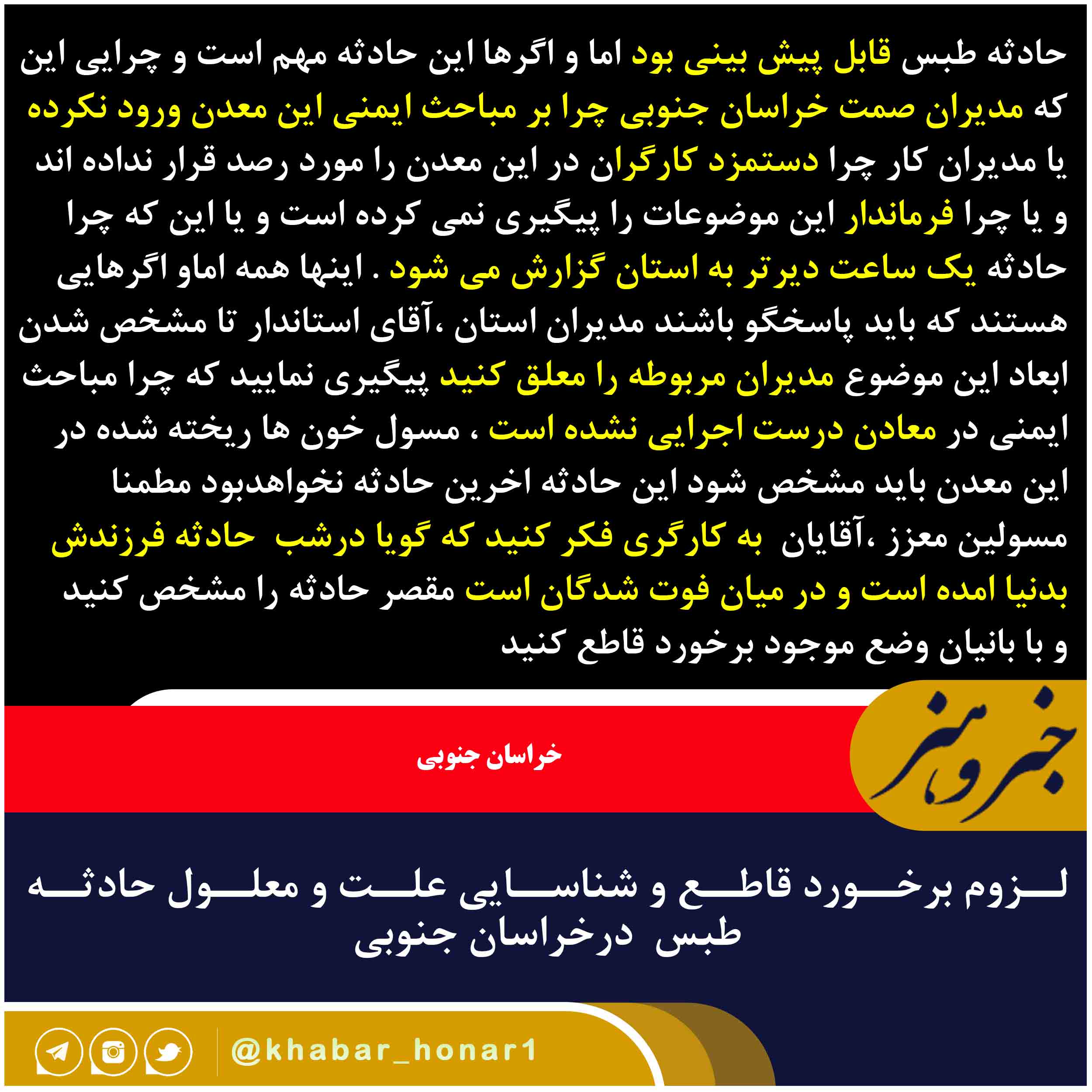 حادثه طبس قابل پیش بینی بود اما و اگرها این حادثه مهم است و چرایی این که مدیران صمت خراسان جنوبی چرا بر مباحث ایمنی این معدن ورود نکرده یا مدیران کار چرا دستمزد کارگران در این معدن را مورد رصد قرار نداده اند و یا چرا فرماندار این موضوعات را پیگیری نمی کرده است و یا این که چرا حادثه یک ساعت دیرتر به استان گزارش می شود . اینها همه اماو اگرهایی هستند که باید پاسخگو باشند مدیران استان ،آقای استاندار تا مشخص شدن ابعاد این موضوع مدیران مربوطه را معلق کنید پیگیری نمایید که چرا مباحث ایمنی در معادن درست اجرایی نشده است ، مسول خون ها ریخته شده در این معدن باید مشخص شود این حادثه اخرین حادثه نخواهدبود مطمنا مسولین معزز ،آقایان به کارگری فکر کنید که گویا درشب حادثه فرزندش بدنیا امده است و در میان فوت شدگان است مقصر حادثه را مشخص کنید و با بانیان وضع موجود برخورد قاطع کنید