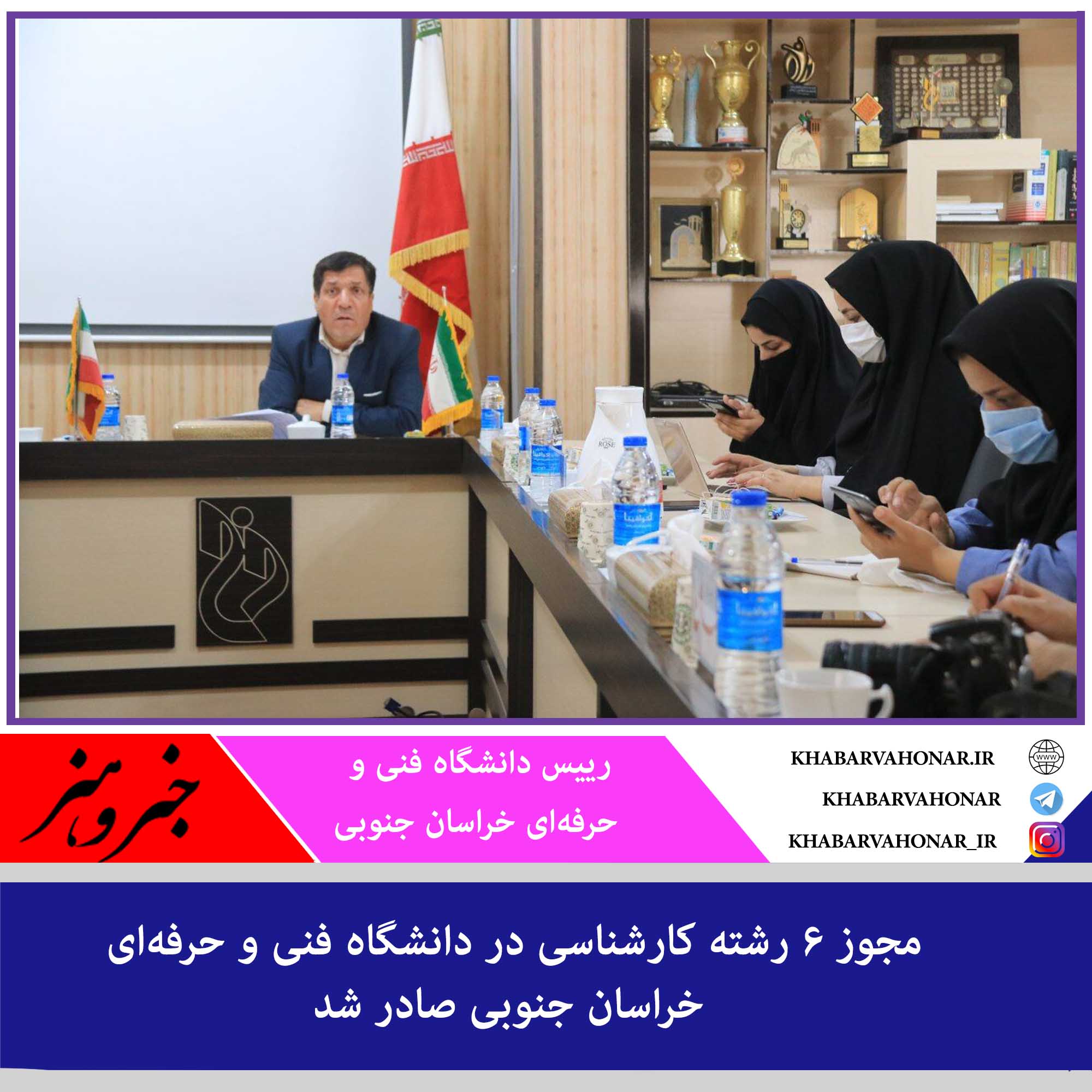 رییس دانشگاه فنی و حرفه‌ای خراسان جنوبی گفت: از سال گذشته تاکنون مجوز ۶ رشته جدید کارشناسی برای این دانشگاه صادر شد که از مهرماه نسبت به پذیرش دانشجو در این رشته‌ها اقدام می‌شود.