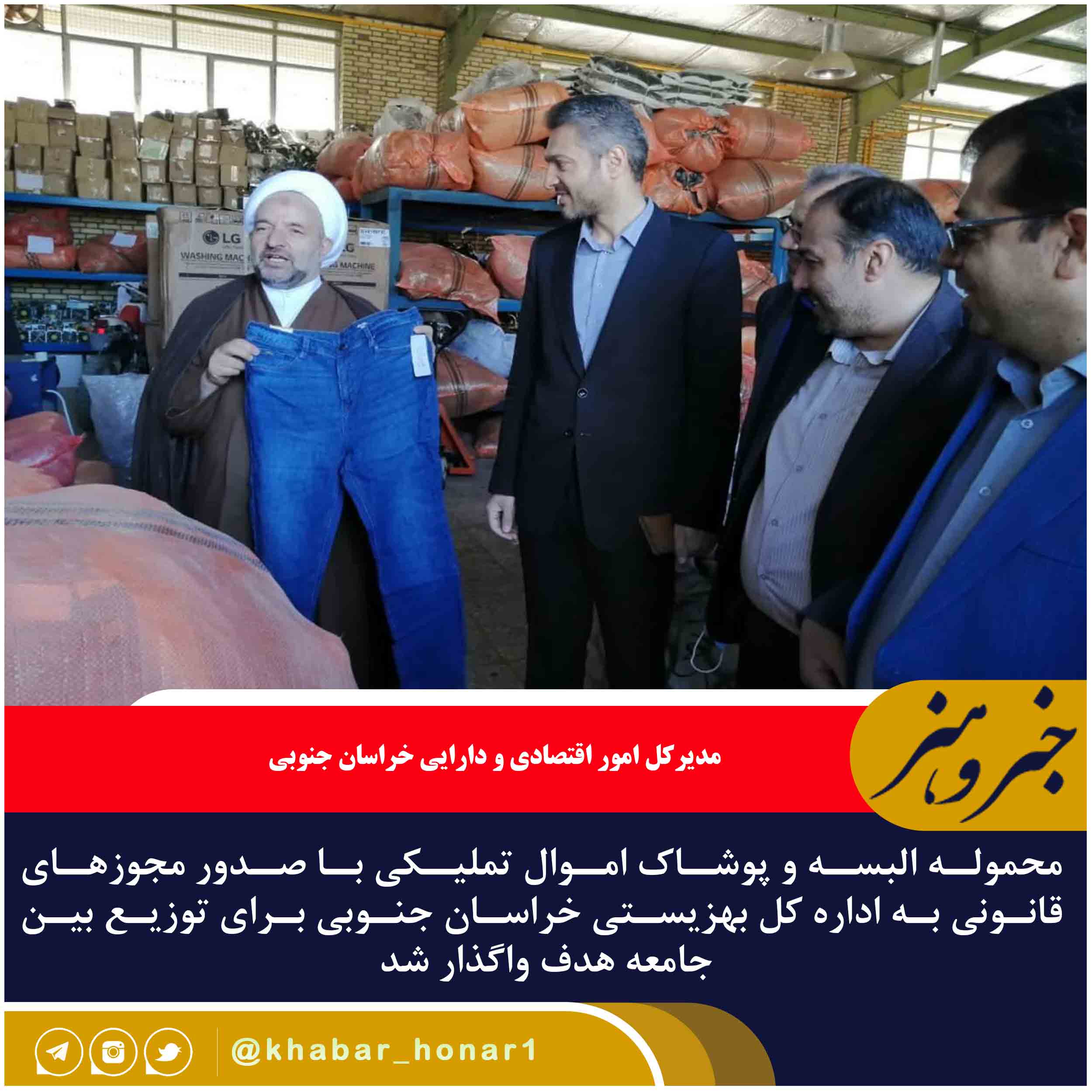محموله البسه و پوشاک اموال تملیکی با صدور مجوزهای قانونی به اداره کل بهزیستی خراسان جنوبی برای توزیع بین جامعه هدف واگذار شد.