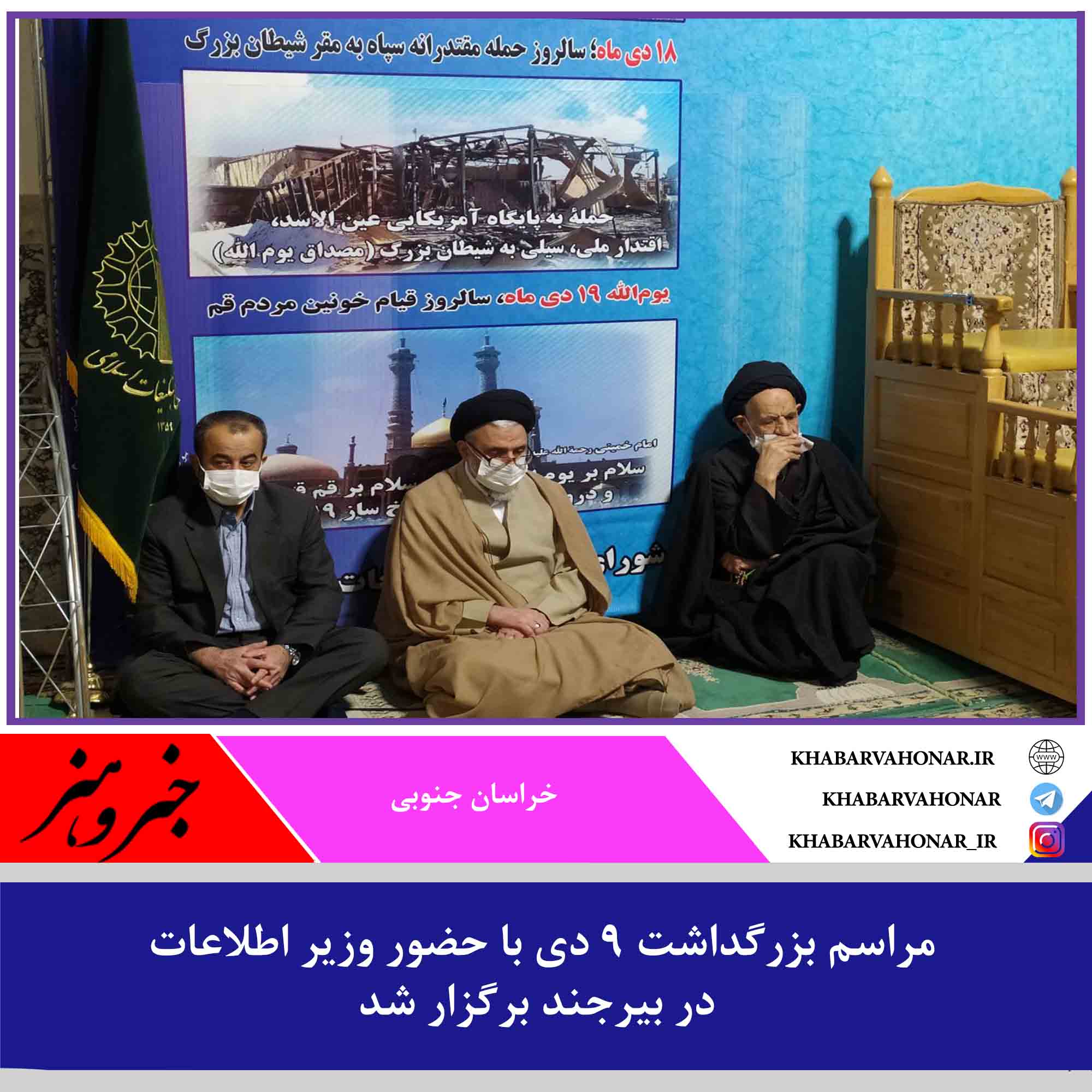 مراسم بزرگداشت روز بصیرت و میثاق امت با ولایت با حضور وزیر اطلاعات، نماینده ولی فقیه در استان و امام جمعه بیرجند، استاندار خراسان جنوبی، مسوولان استان و قشرهای مختلف مردم در مسجد امام حسین (ع) بیرجند برگزار و بهطور زنده از شبکه استانی خاوران نیز پخش شد.
