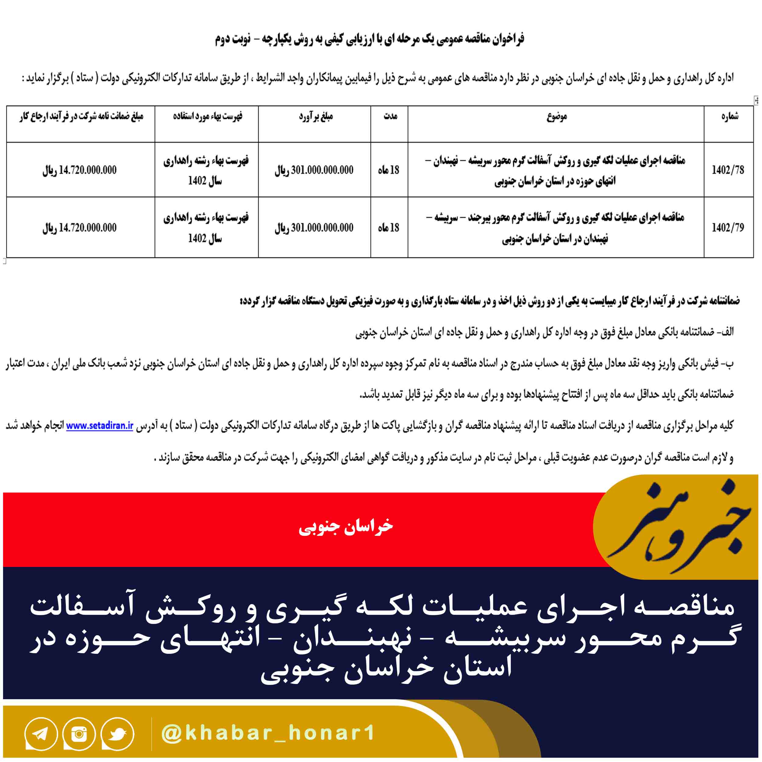 | ۷۹/۱۴۰۲ | مناقصه اجرای عملیات لکه گیری و روکش آسفالت گرم محور بیرجند – سربیشه – نهبندان در استان خراسان جنوبی | ۱۸ ماه | ۳۰۱.۰۰۰.۰۰۰.۰۰۰ ریال | فهرست بهاء رشته راهداری