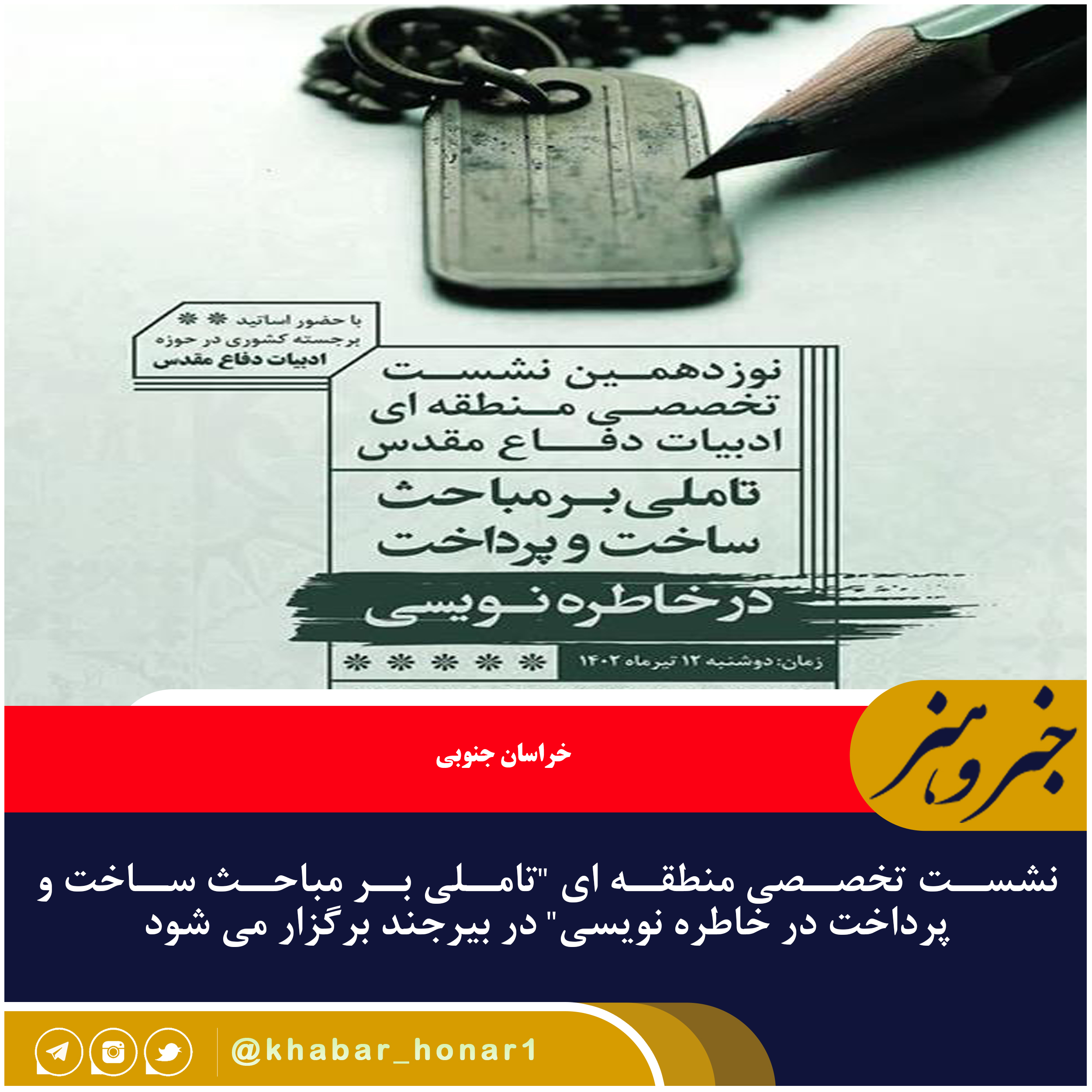 نوزدهمین نشست تخصصی منطقه ای “ادبیات دفاع مقدس” به منظور آسیب شناسی و شناخت بیشتر نویسندگان با ساخت و پرداخت «خاطره نویسی» با حضور اساتید برجسته کشوری، آقایان دکتر شاه رضایی، دکتر جواد کامور بخشایش، جواد کلاته عربی، مسعود امیرخانی، قاسم فروغی جهرمی و خانم ها معصومه رامهرمزی، مرضیه نظرلو، منیژه کفانی همچنین خاطره‌نویسان و نویسندگان در بیرجند برگزار خواهد شد.