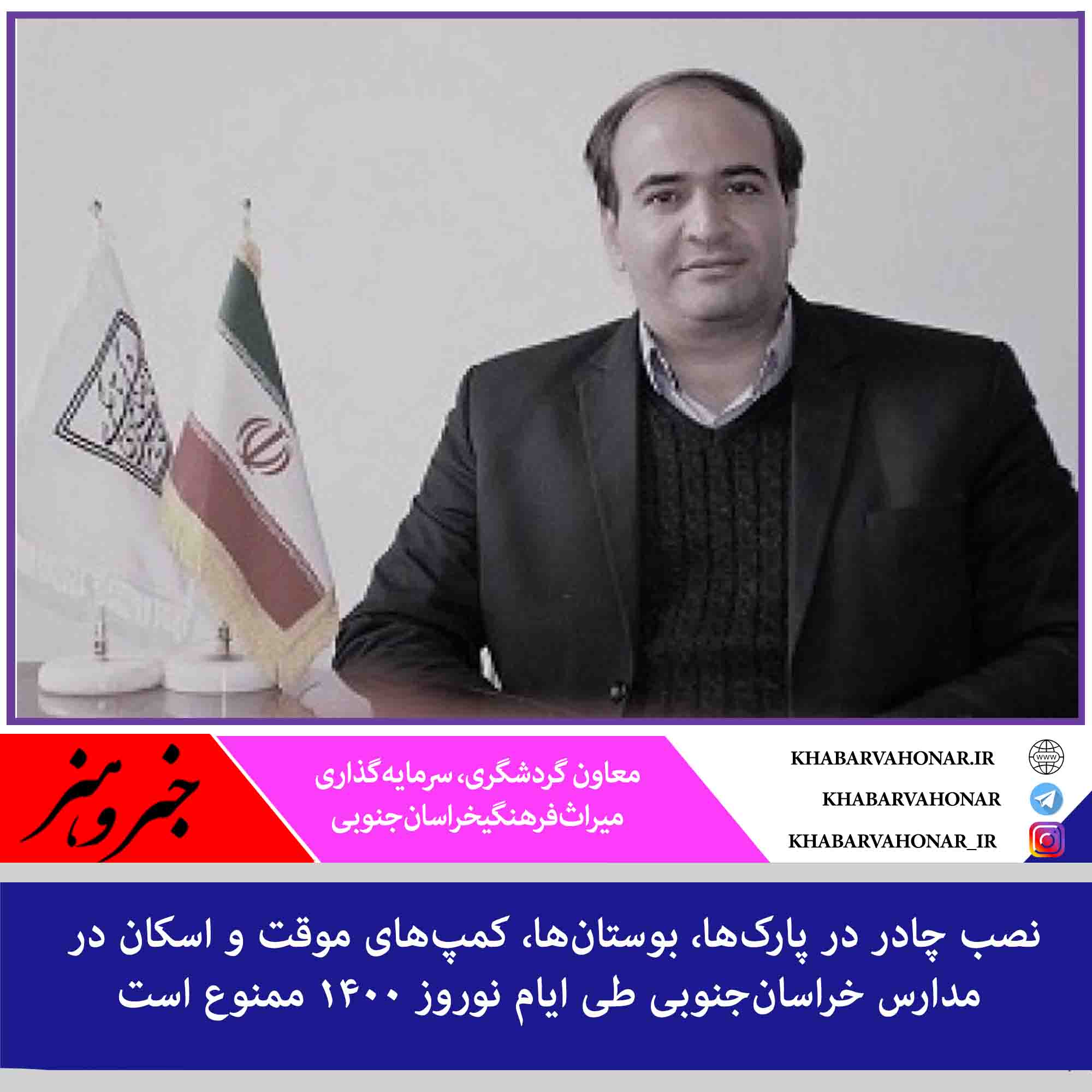 معاون گردشگری، سرمایهگذاری و تامین منابع ادارهکل میراثفرهنگی، گردشگری و صنایعدستی استان خراسانجنوبی، از ممنوع بودن نصب چادر و اسکان در مدارس در طی نوروز ۱۴۰۰ خبر داد.