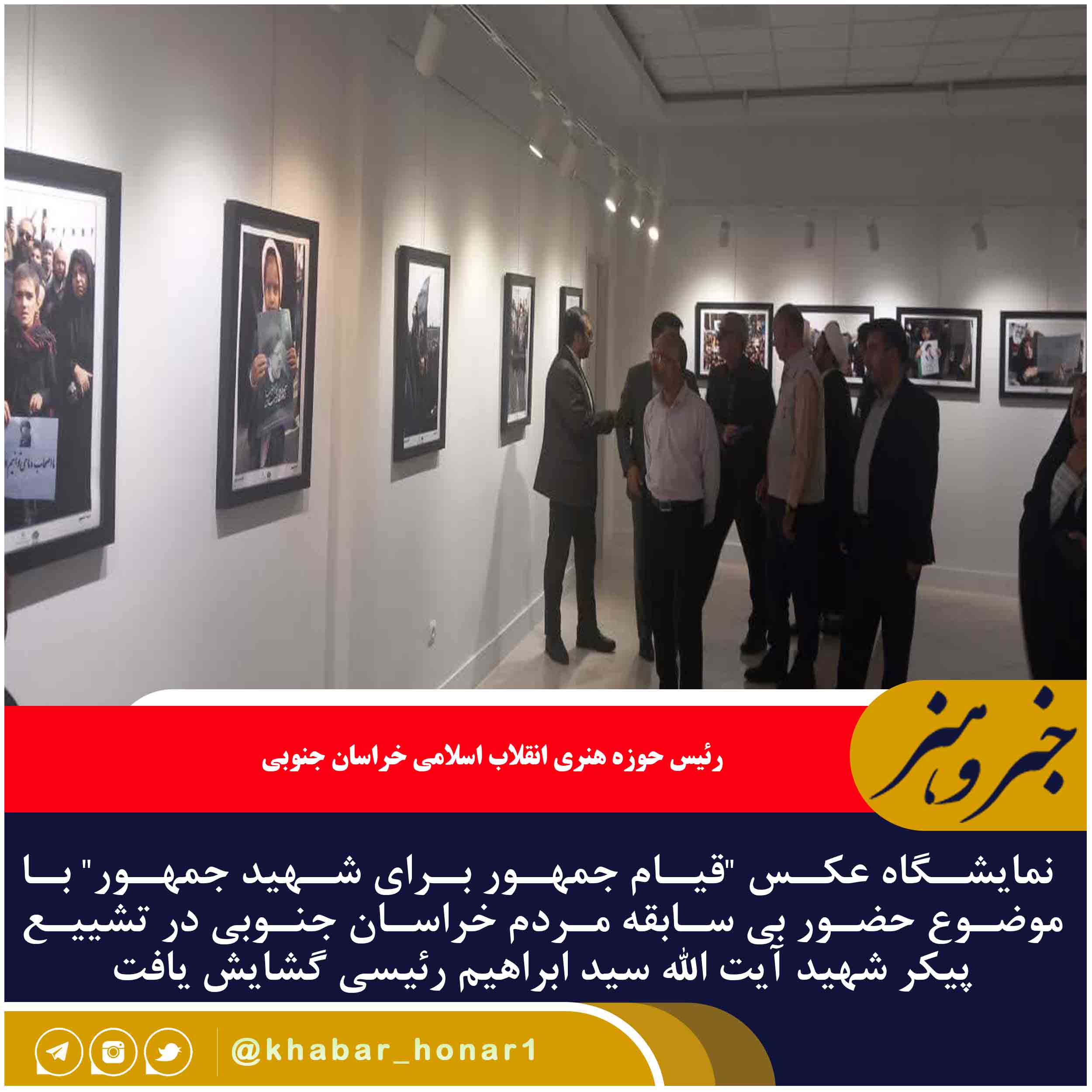 رئیس حوزه هنری خراسان جنوبی گفت: نمایشگاه قیام جمهور برای شهید جمهور از امروز تا پنجشنبه هفته جاری از ساعت ۹ تا ۱۲ به روی علاقه مندان باز است.