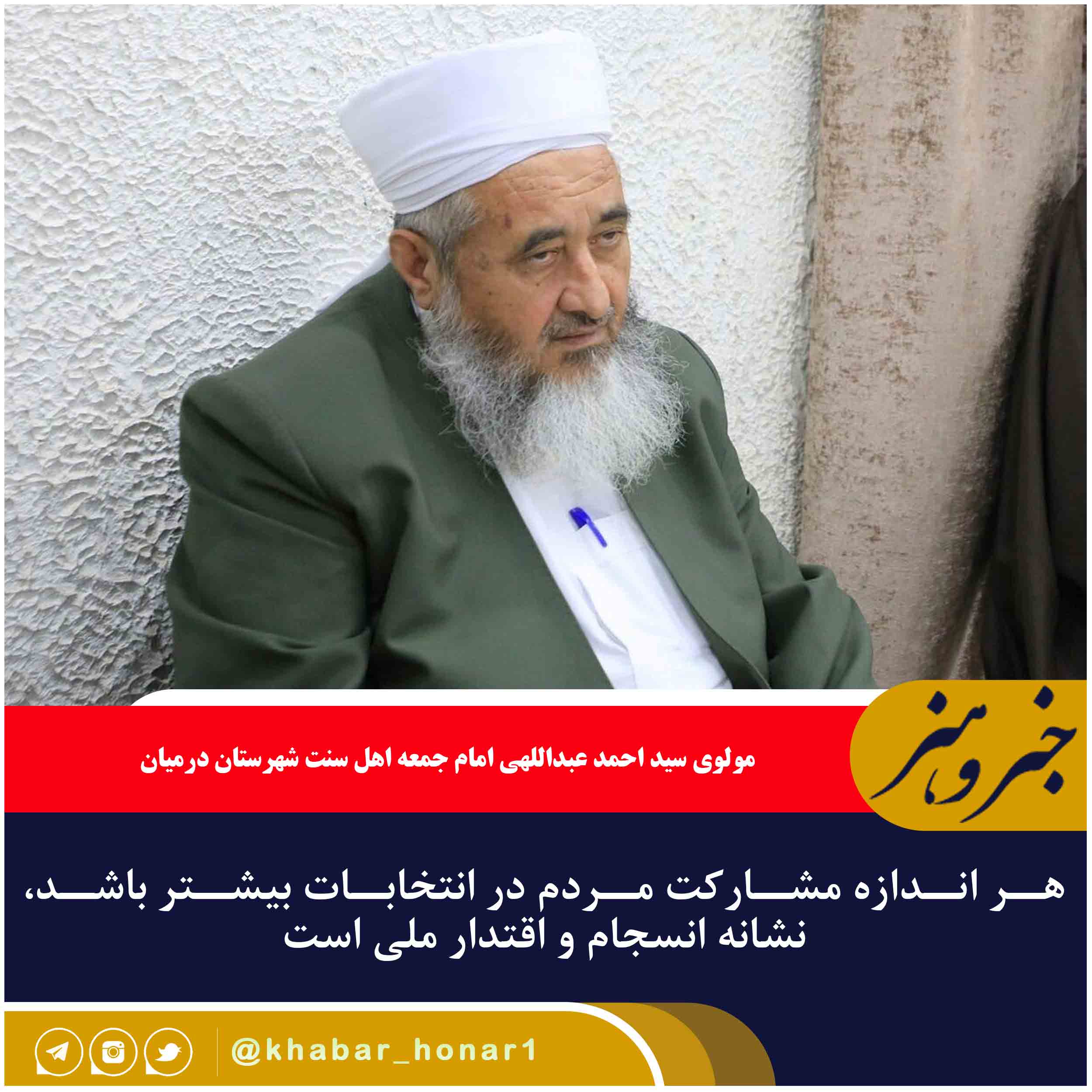 مولوی سید احمد عبداللهی امام جمعه اهل سنت شهرستان درمیان گفت: وجود برخی مشکلات دلیل بر شرکت نکردن در انتخابات نیست بلکه برای حل مشکلات باید با شرکت در انتخابات، افراد کارآمد را به مجلس بفرستیم.