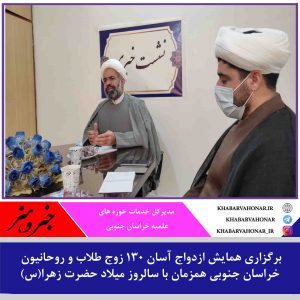 حجت الاسلام جعفری راد از برگزاری همایش ازدواج آسان ۱۳۰ زوج طلاب و روحانیون خراسان جنوبی همزمان با سالروز میلاد حضرت زهرا(س) خبر داد