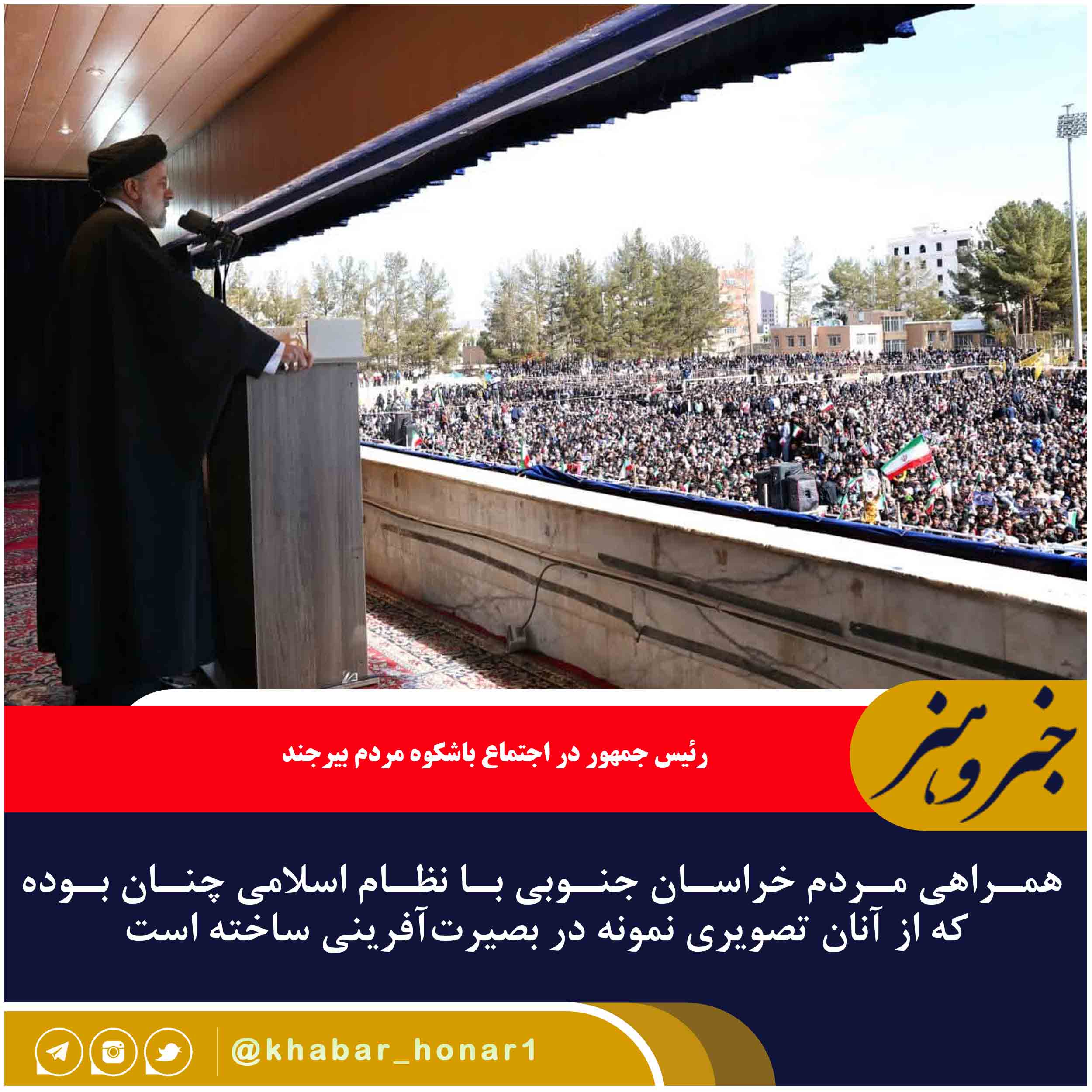 ?دکتر رئیسی در بخش دیگری از سخنان خود در اجتماع پرشور مردم بیرجند انسجام و وحدت را زمینه هرگونه توسعه یافتگی در کشور دانست و گفت: از موهبتهای خدای متعال به استان خراسان جنوبی مسألت انسجام و وحدت است که شیعه و سنی سالها در کنار هم برادرانه زیستهاند و دلشان برای نظام و ارزشهای انقلاب اسلامی میتپد. این انسجام و وحدت زمینه هرگونه توسعهیافتگی در کشور است و همه تریبونداران اعم از علمای شیعه و سنی، فرهیختگان و دیگر چهرههای اثرگذار باید همواره بر ضرورت حفظ این وحدت تأکید کنند.