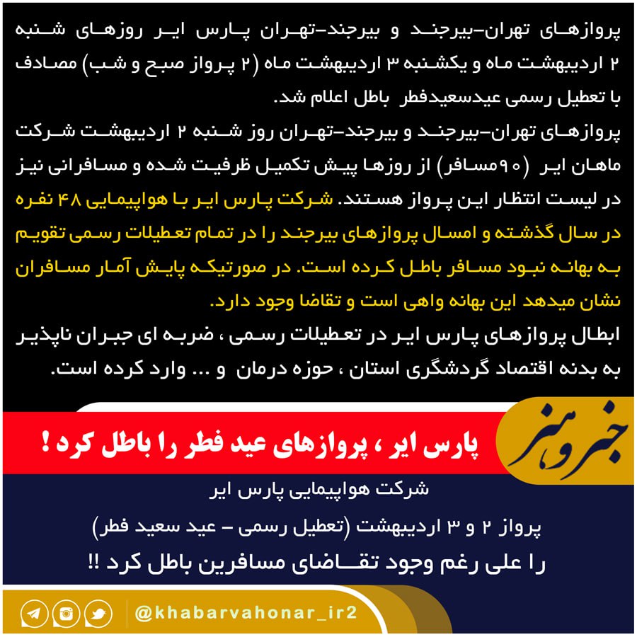 پروازهای تهران-بیرجند و بیرجند-تهران پارس ایر روزهای شنبه ۲ اردیبهشت ماه و یکشنبه ۳ اردیبهشت ماه (۲ پرواز صبح و شب) مصادف با تعطیل رسمی عیدسعیدفطر باطل اعلام شد.
