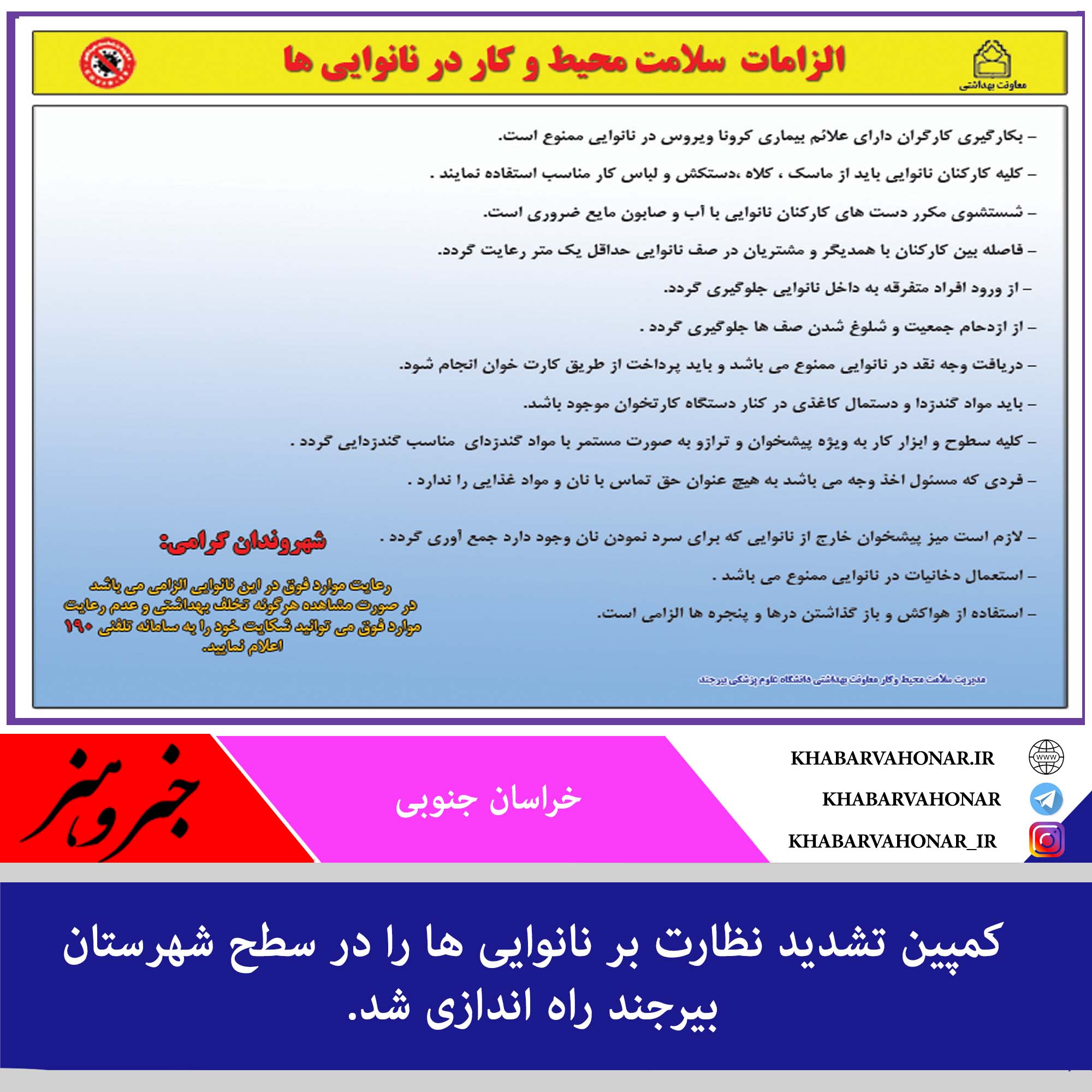 با توجه به شیوع بیماری کرونا ویروس ، و لزوم نظارت هر چه بیشتر بر مراکز تهیه و توزیع مواد غذایی به ویژه نانوایی ها، معاونت بهداشتی دانشگاه علوم پزشکی بیرجند در نظر دارد با همکاری سایر ادارات و دستگاه های مرتبط از امروز کمپین تشدید نظارت بر نانوایی ها را در سطح شهرستان بیرجند راه اندازی نماید.