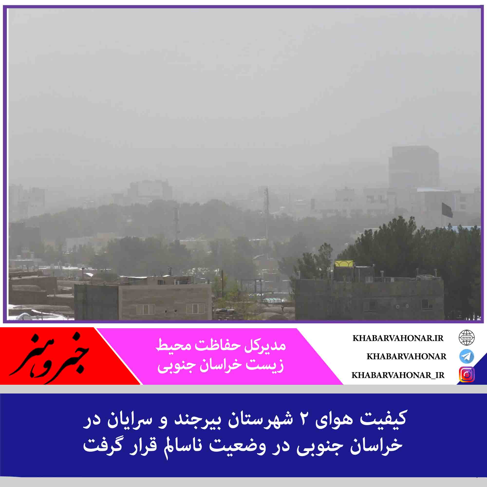 مدیرکل حفاظت محیط زیست خراسان جنوبی گفت: کیفیت هوای ۲ شهر خراسان جنوبی در وضعیت ناسالم است و گروههای حساس در شهرستانهای بیرجند و سرایان حتیالامکان امروز از منزل خارج نشوند.