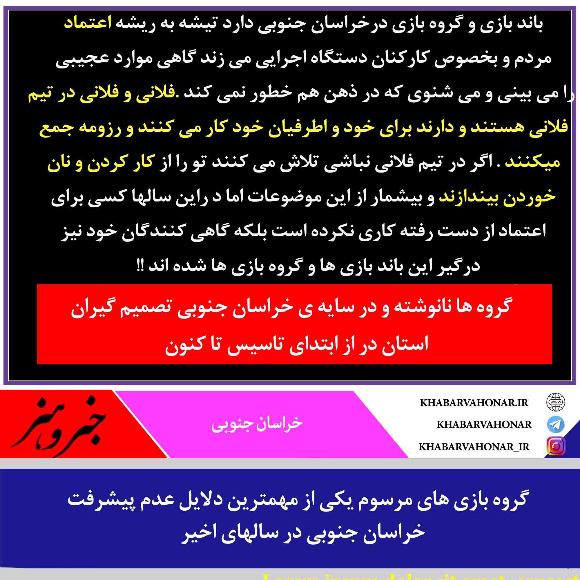 باند بازی و گروه بازی درخراسان جنوبی دارد تیشه به ریشه اعتماد مردم و بخصوص کارکنان دستگاه اجرایی می زند گاهی موارد عجیبی را می بینی و می شنوی که در ذهن هم خطور نمی کند .فلانی و فلانی در تیم فلانی هستند و دارند برای خود و اطرفیان خود کار می کنند و رزومه جمع میکنند . اگر در تیم فلانی نباشی تلاش می کنند تو را از کار کردن و نان خوردن بیندازند و بیشمار از این موضوعات اما د راین سالها کسی برای اعتماد از دست رفته کاری نکرده است بلکه گاهی کنندگان خود نیز درگیر این باند بازی ها و گروه بازی ها شده اند !!