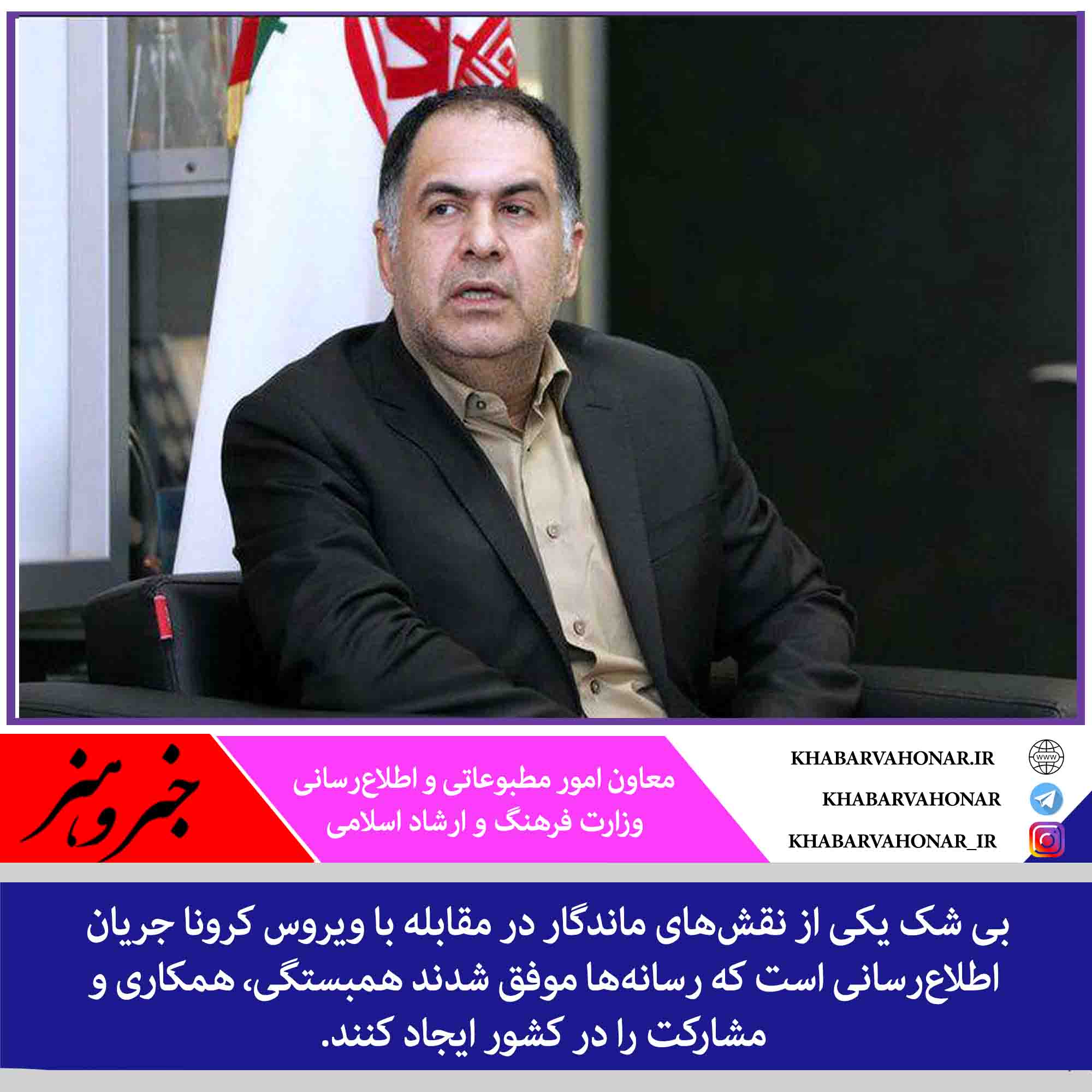 معاون امور مطبوعاتی و اطلاعرسانی وزارت فرهنگ و ارشاد اسلامی گفت: بی شک یکی از نقشهای ماندگار در مقابله با ویروس کرونا جریان اطلاعرسانی است که رسانهها موفق شدند همبستگی، همکاری و مشارکت را در کشور ایجاد کنند.
