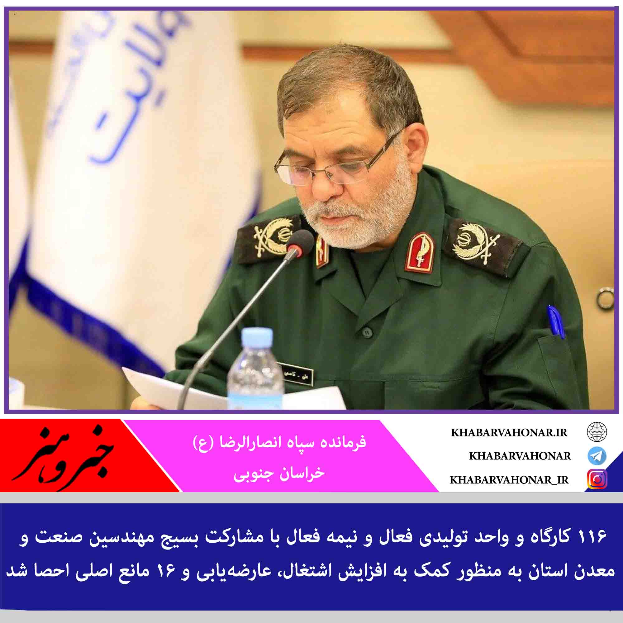 فرمانده سپاه انصارالرضا (ع) خراسان جنوبی گفت: ۱۱۶ کارگاه و واحد تولیدی فعال و نیمه فعال با مشارکت بسیج مهندسین صنعت و معدن استان به منظور کمک به افزایش اشتغال، عارضهیابی و ۱۶ مانع اصلی احصا شد.