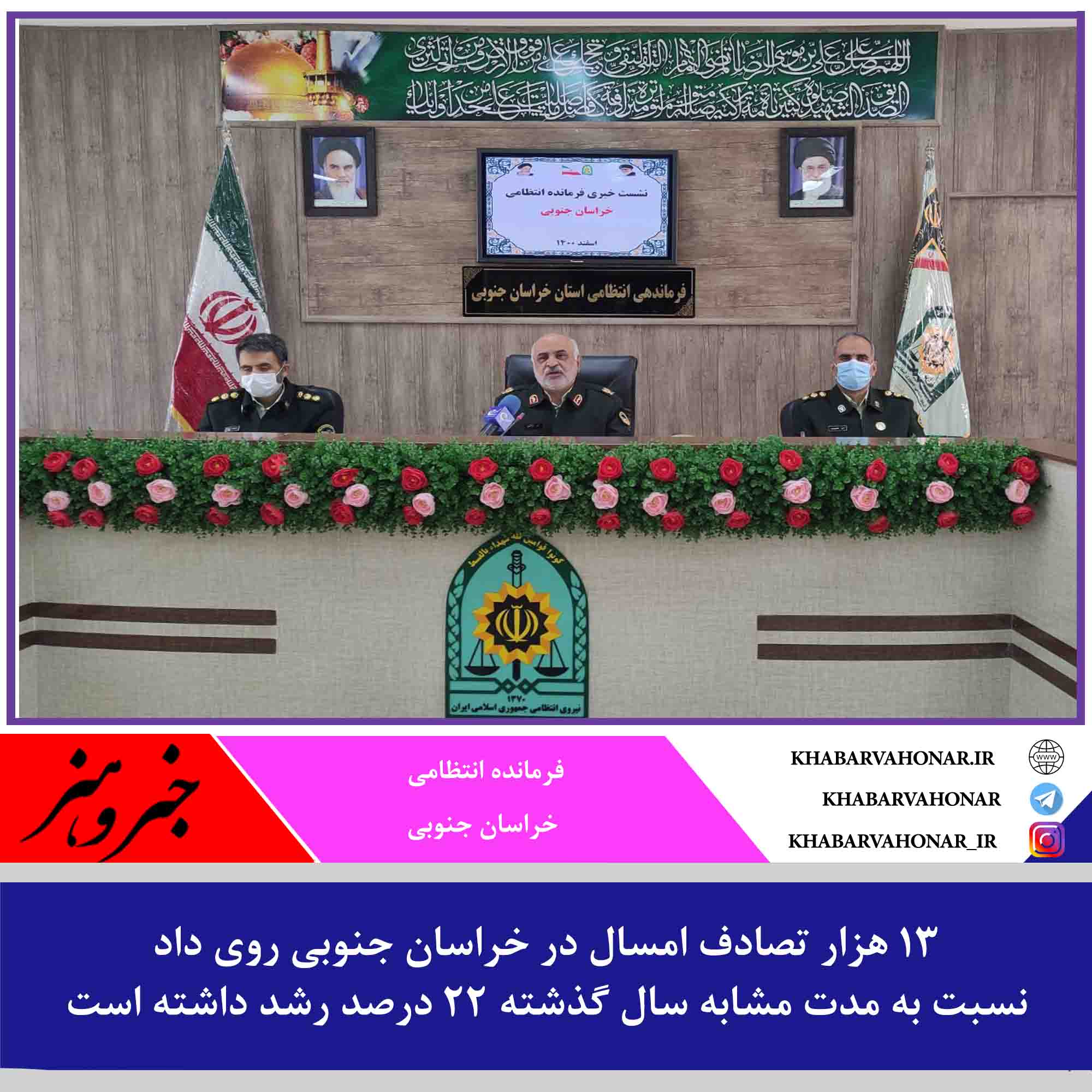 فرمانده انتظامی خراسان جنوبی گفت: امسال ۱۳ هزار فقره تصادف در محورهای درون شهری و برون شهری استان روی داده که نسبت به مدت مشابه سال گذشته ۲۲ درصد رشد داشته است.