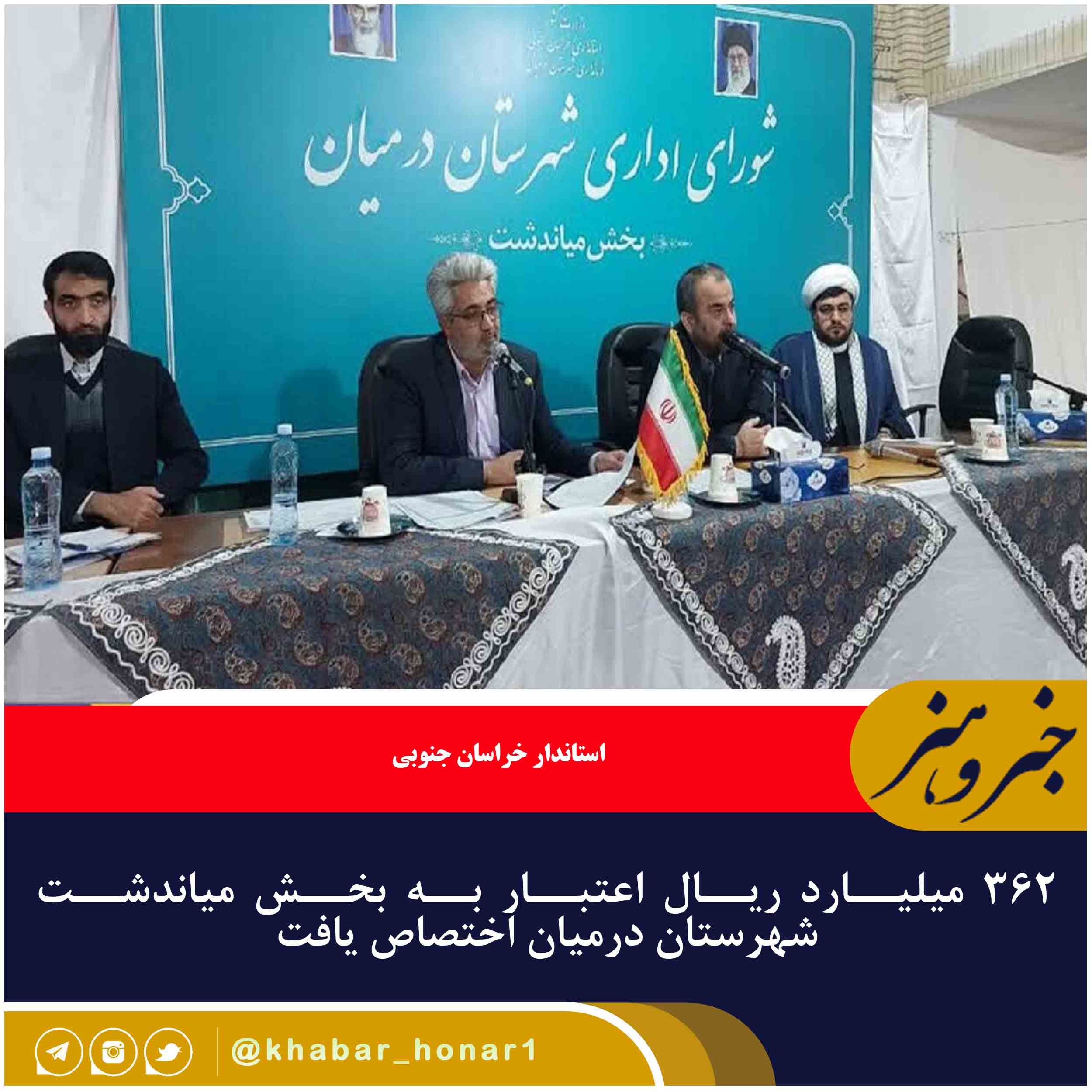استاندار خراسان جنوبی از اختصاص ۳۶۲ میلیارد ریال اعتبار به بخش میاندشت شهرستان درمیان در پی سفر به این بخش خبر داد.