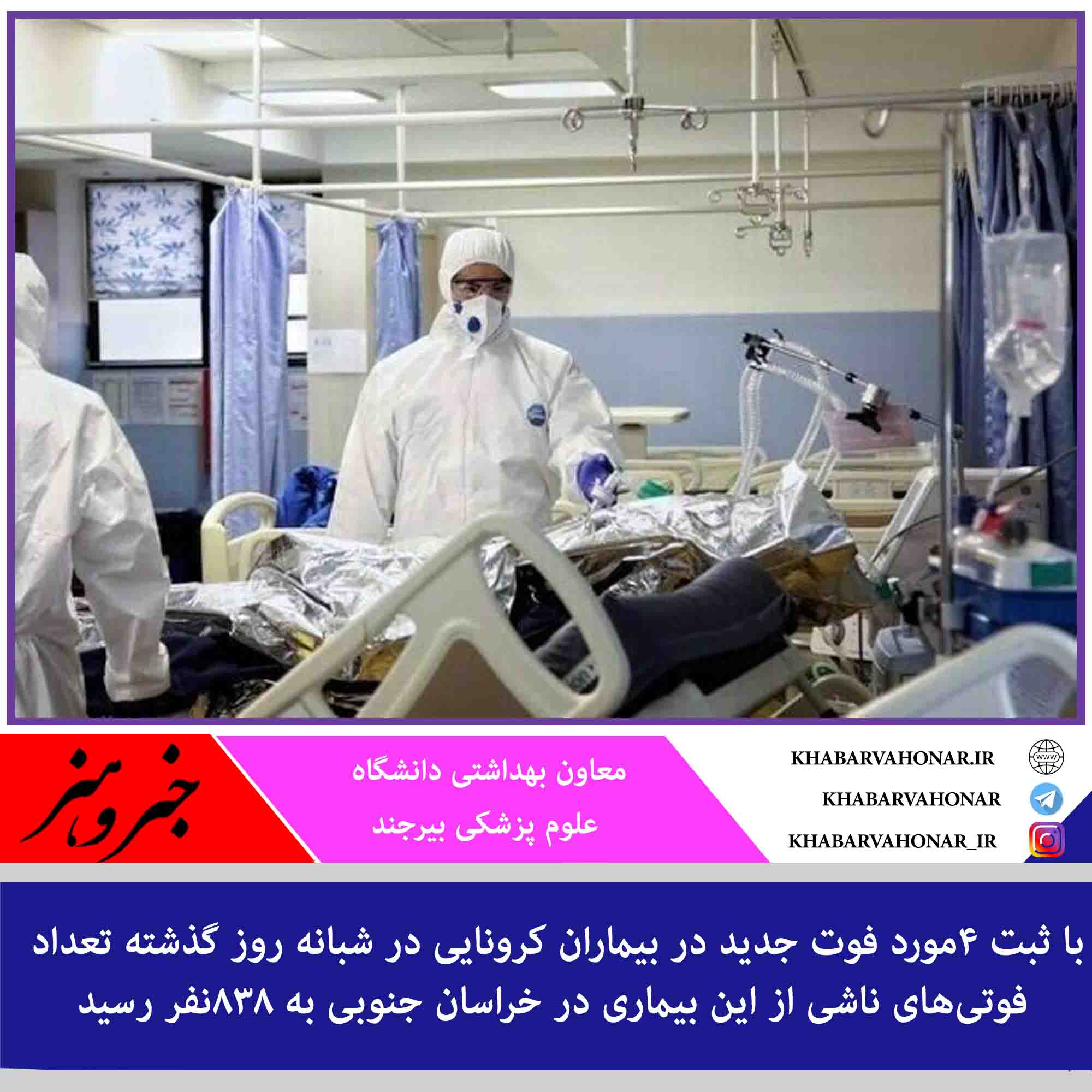 در شبانه روز گذشته با ثبت ۴مورد فوت جدید در بیماران کرونایی در شبانه روز گذشته تعداد فوتیهای ناشی از این بیماری در خراسان جنوبی به ۸۳۸نفر رسید.