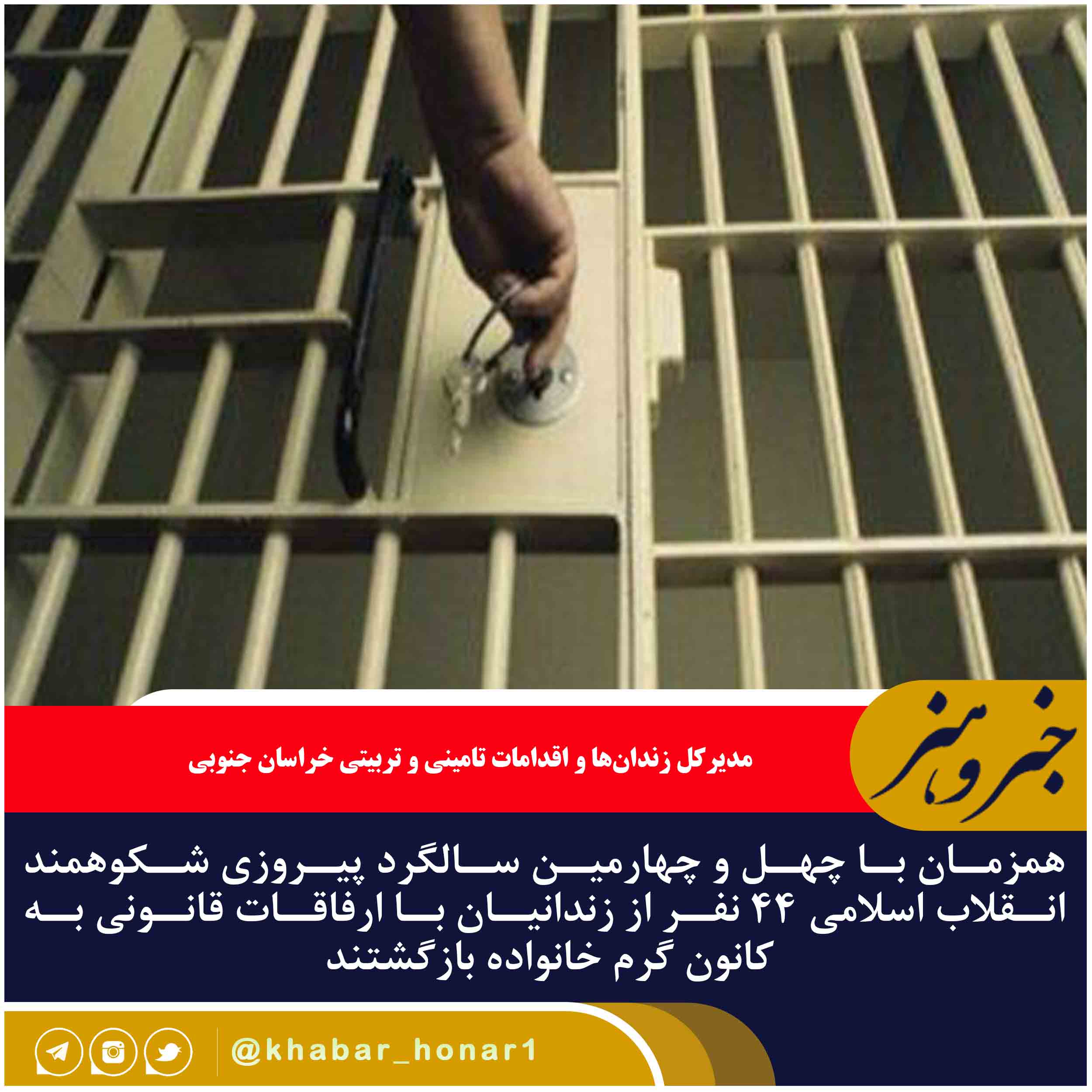 مدیرکل زندانها و اقدامات تامینی و تربیتی خراسان جنوبی گفت: همزمان با چهل و چهارمین سالگرد پیروزی شکوهمند انقلاب اسلامی ۴۴ نفر از زندانیان با ارفاقات قانونی به کانون گرم خانواده بازگشتند.
