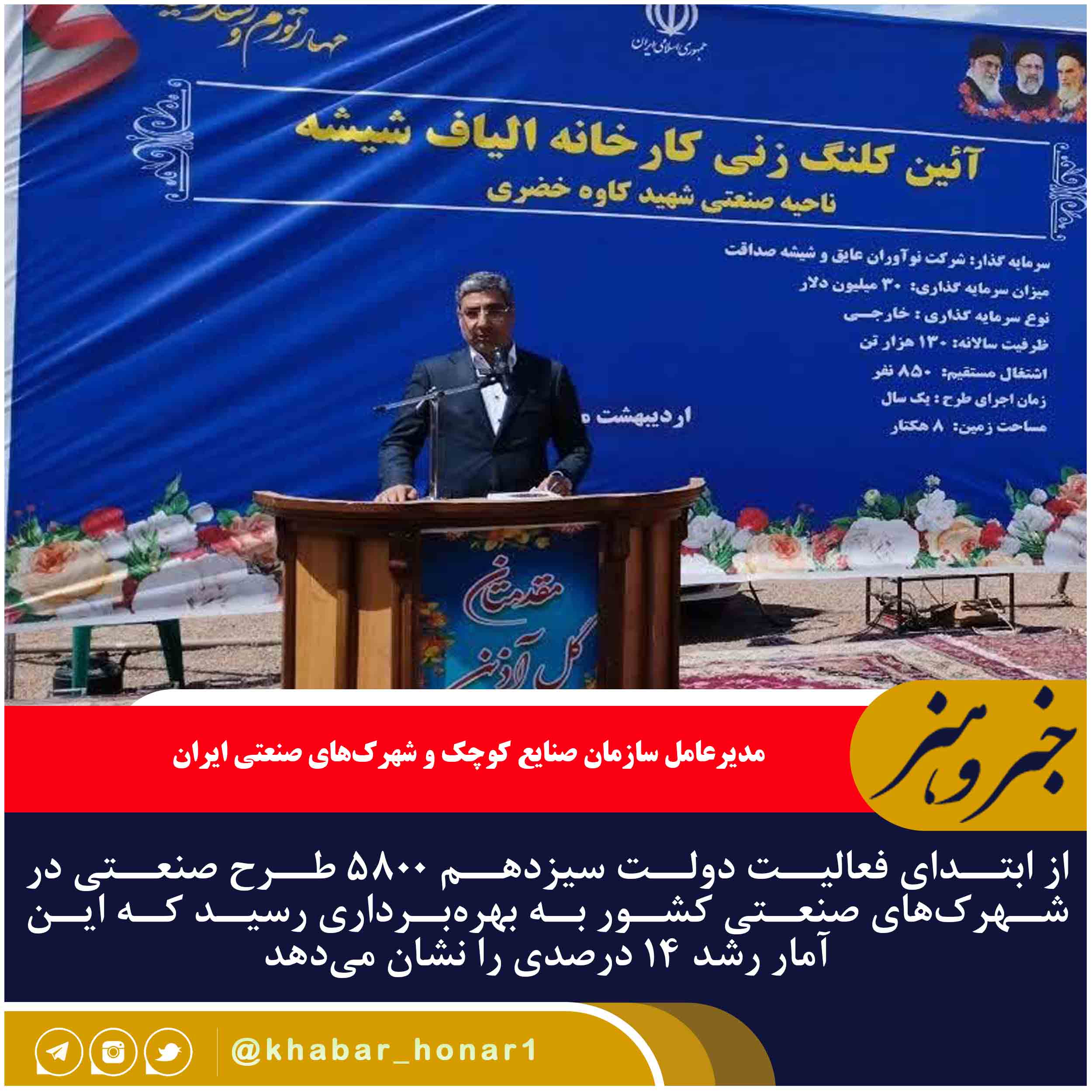 مدیرعامل سازمان صنایع کوچک و شهرکهای صنعتی ایران گفت: از ابتدای فعالیت دولت سیزدهم ۵۸۰۰ طرح صنعتی در شهرکهای صنعتی کشور به بهرهبرداری رسید که این آمار رشد ۱۴ درصدی را نشان میدهد.