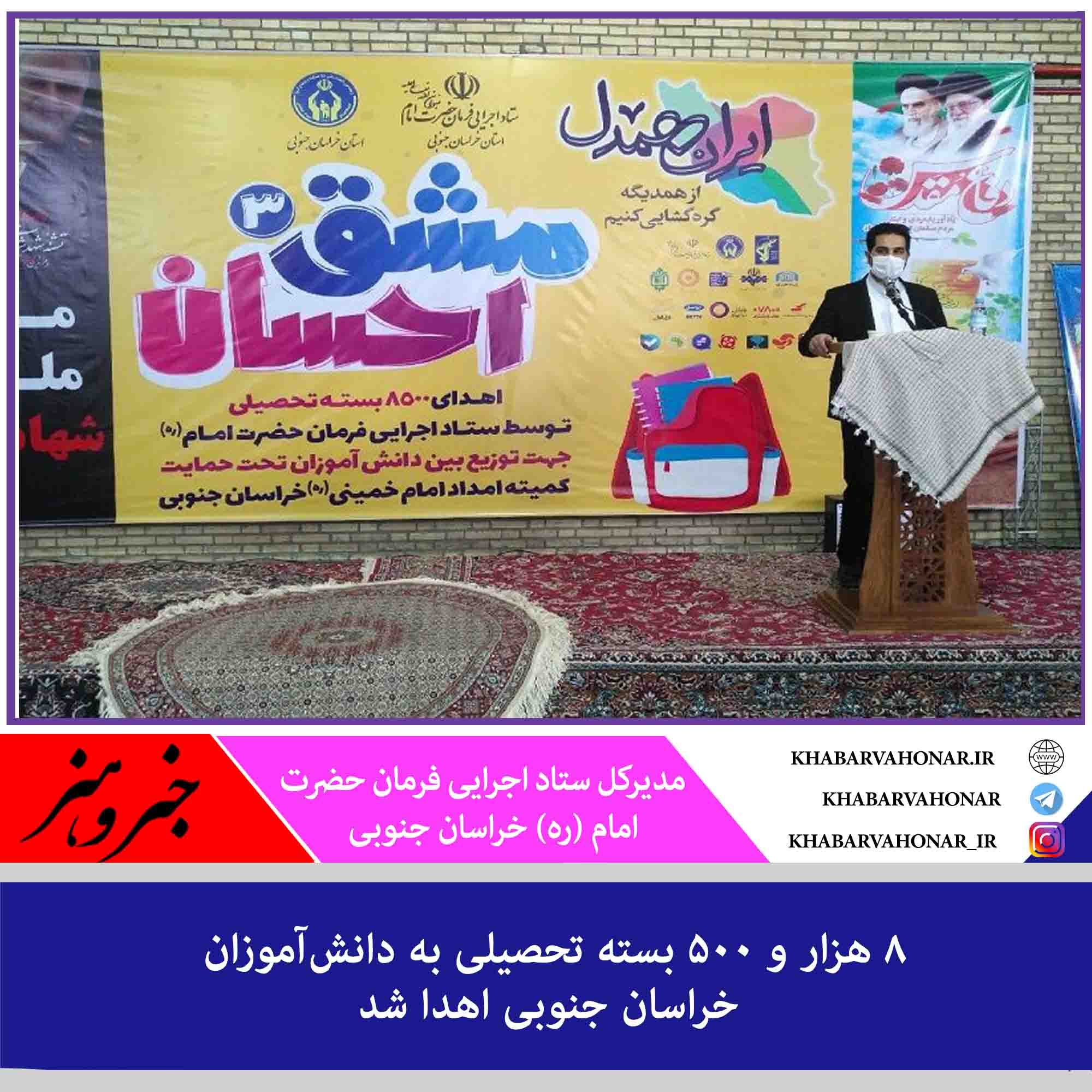 هشت هزار و ۵۰۰ بسته تحصیلی از سوی ستاد اجرایی فرمان حضرت امام (ره) با عنوان «مشق احسان» برای توزیع بین دانش‌آموزان تحت حمایت کمیته امداد خراسان جنوبی اهدا شد.