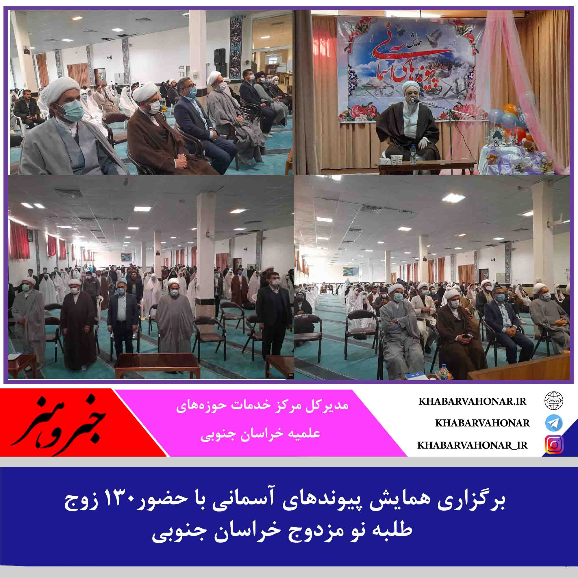 ?مدیرکل مرکز خدمات حوزههای علمیه خراسان جنوبی در مراسم ازدواج طلاب در بیرجند : هر سال یکبار مراسم ازدواج طلاب در سالروز ولادت حضرت زهرا (س) برگزار میشود و امسال ۱۳۰ زوج جوان طلبه با در پیش گرفتن زندگی ساده و آسان و الگو گرفتن از زندگی حضرت زهرا (س) راهی خانه بخت شدند.