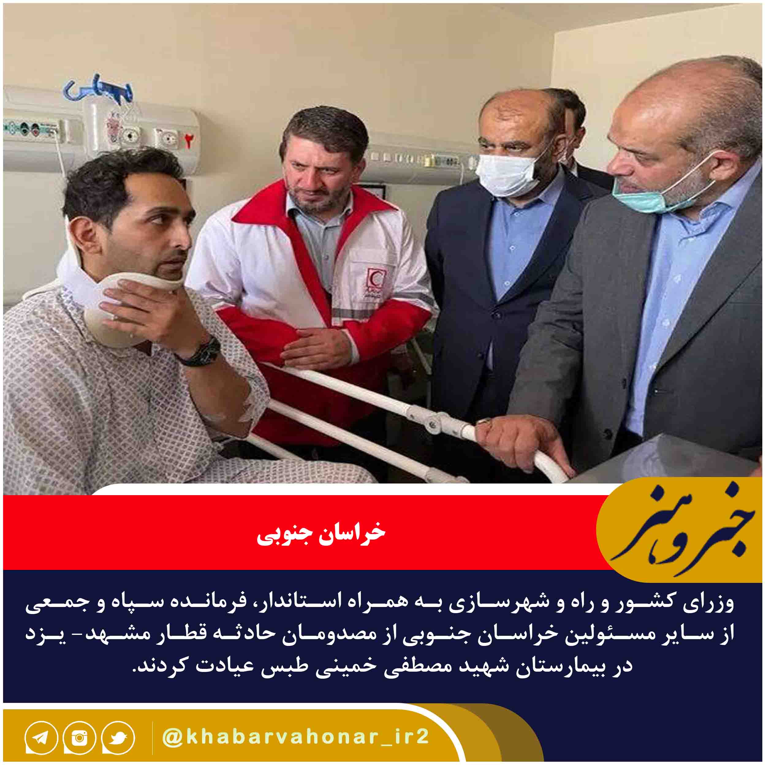 ?وزرای کشور و راه و شهرسازی به همراه استاندار، فرمانده سپاه و جمعی از سایر مسئولین خراسان جنوبی از مصدومان حادثه قطار مشهد- یزد در بیمارستان شهید مصطفی خمینی طبس عیادت کردند.