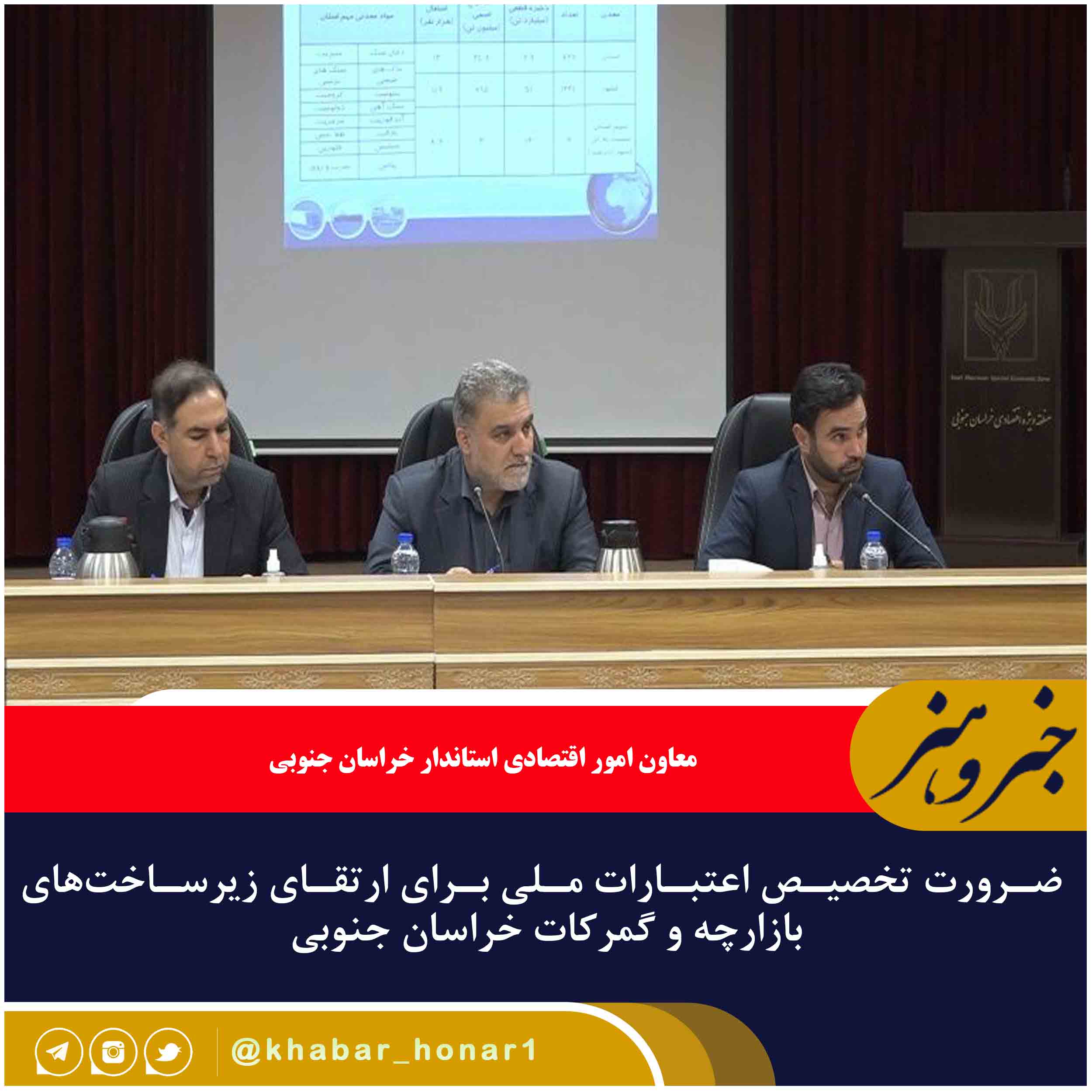 ?معاون هماهنگی امور اقتصادی استاندار خراسان جنوبی گفت: با توجه به اینکه در گمرکات خراسان جنوبی به کل کشور خدمات ارائه میدهیم، لازم است برای ارتقای زیرساختهای بازارچه و گمرکات استان اعتبارات ملی اختصاص یابد.