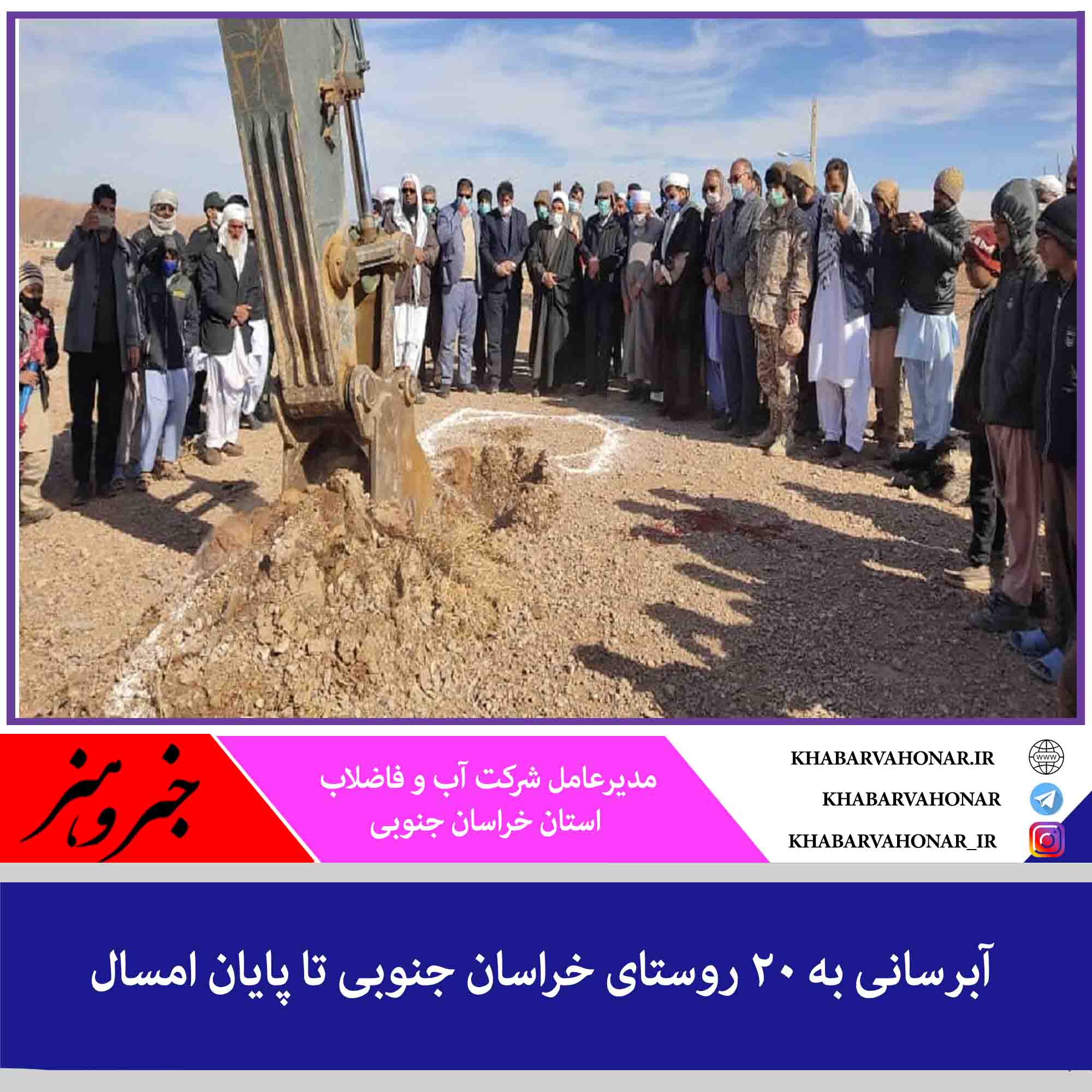 مدیرعامل شرکت آب و فاضلاب استان خراسان جنوبی گفت: تا پایان امسال ۲۰ روستای استان با همکاری بنیاد برکت، بنیاد علوی و بسیج سازندگی از آب شرب سالم برخوردار میشوند.