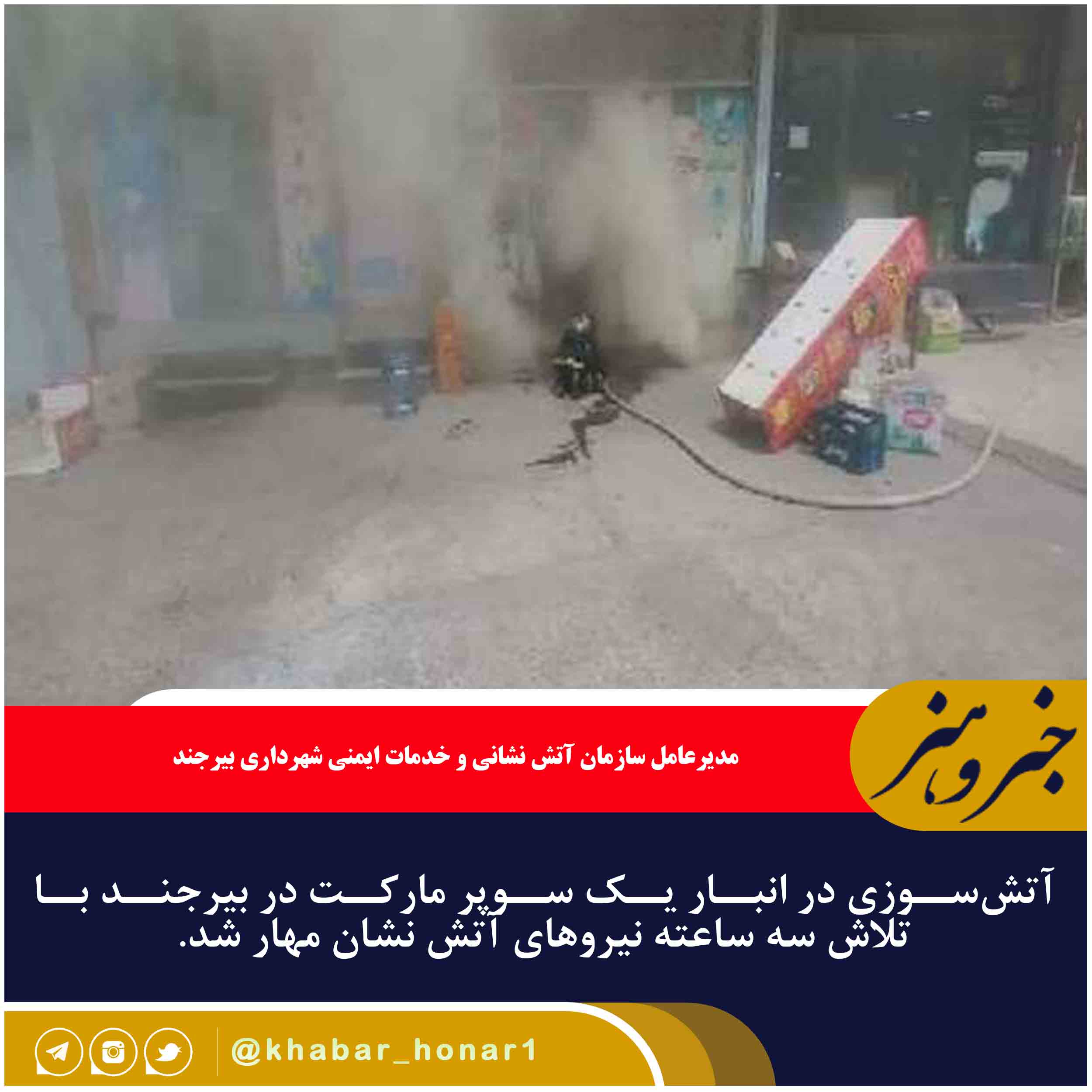 مدیرعامل سازمان آتش نشانی و خدمات ایمنی شهرداری بیرجند گفت: آتشسوزی در انبار یک سوپر مارکت در بیرجند با تلاش سه ساعته نیروهای آتش نشان مهار شد.