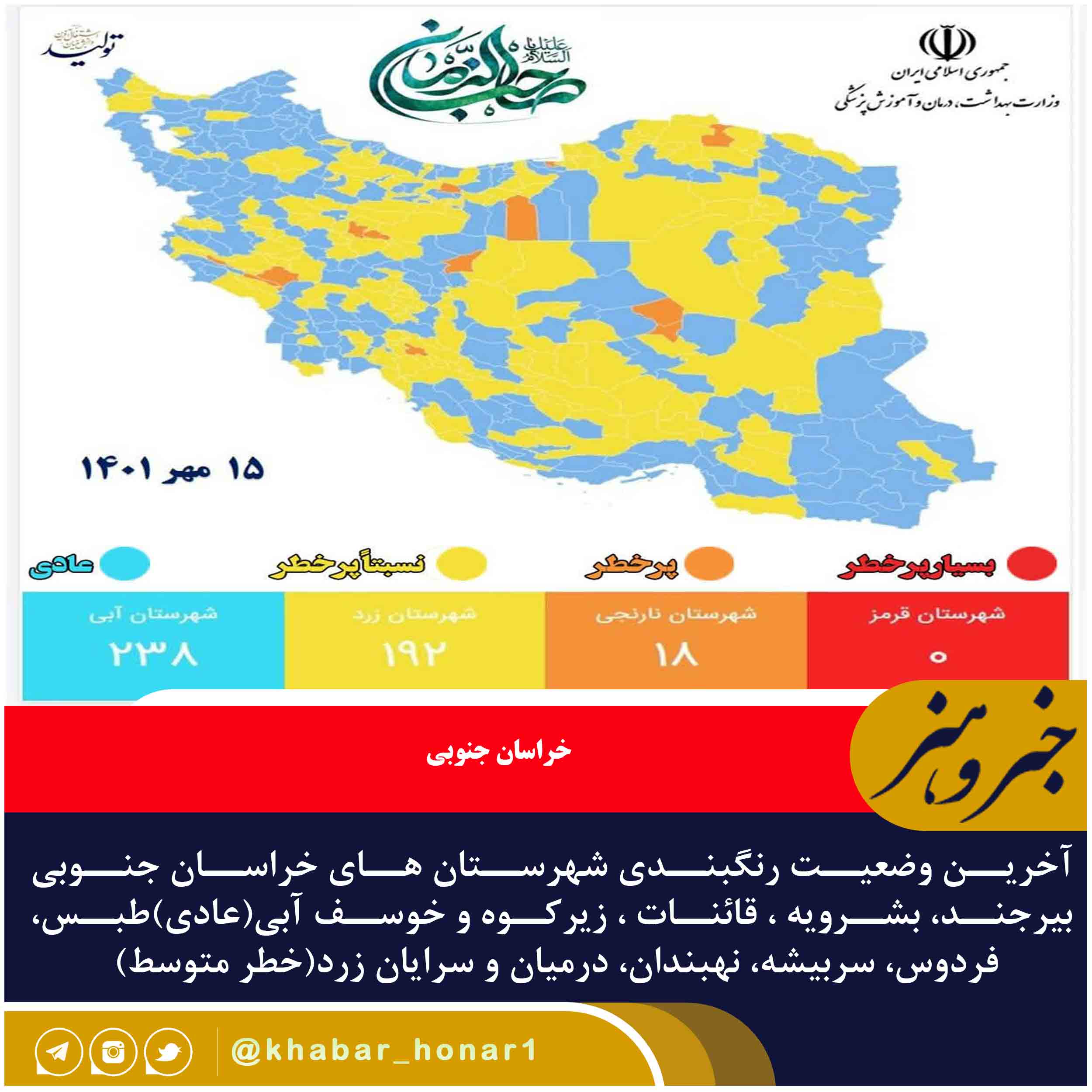 ?بر اساس آخرین بروز رسانی نقشه کرونایی کشور شهرستان طبس از وضعیت آبی به زرد و شهرستان های قائنات و بشرویه از وضعیت زرد به آبی تغییر رنگ دادند.