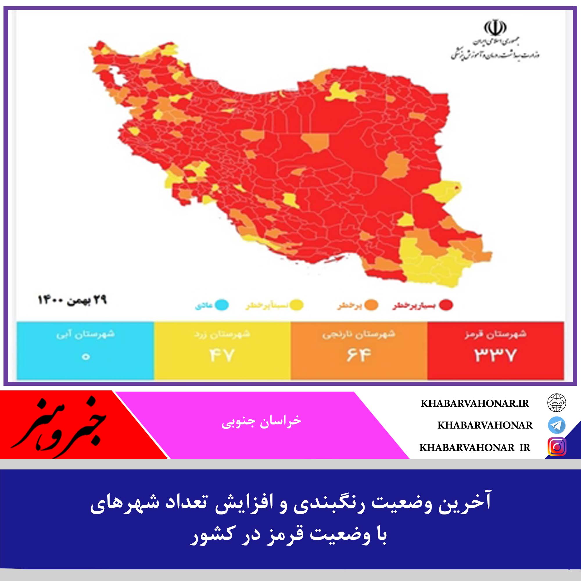 “با گسترش سویه اُمیکرون در کشور و از سوی دیگر کاهش رعایت پروتکل های بهداشتی، تعداد شهرهای با وضعیت قرمز در کشور از ۲۴۷ به ۳۳۷ شهر افزایش یافت.