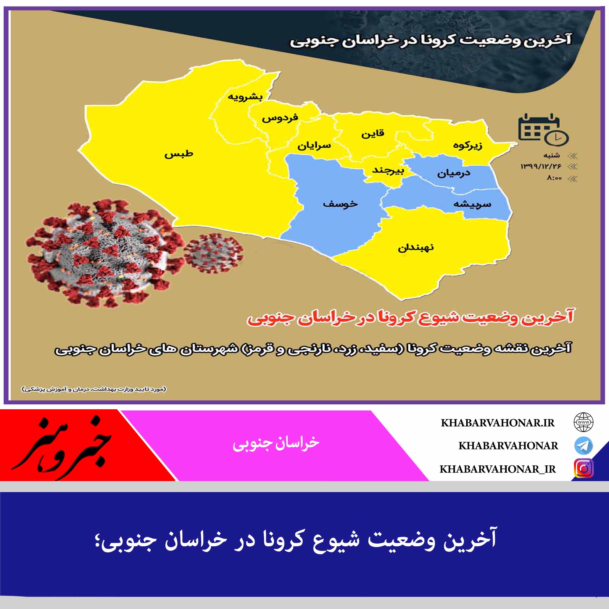 ?آخرین نقشه وضعیت کرونا (سفید، زرد، نارنجی و قرمز) شهرستان های خراسان جنوبی (مورد تایید وزارت بهداشت، درمان و آموزش پزشکی) (بروز رسانی ۲۶ اسفند ماه ۱۳۹۹)