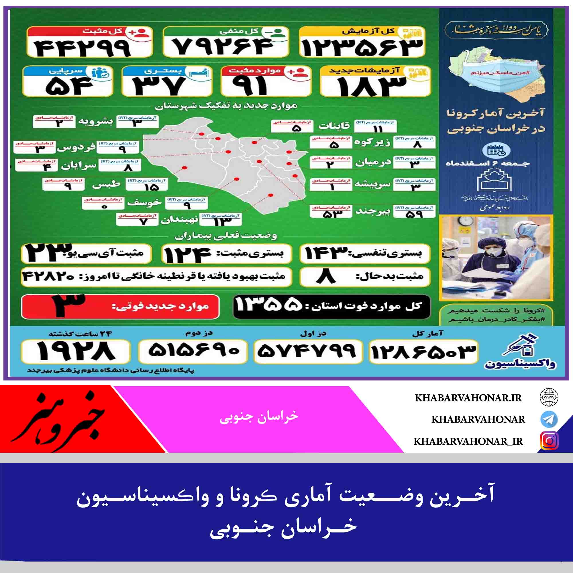 آخـرین وضــعیت آماری ڪرونا و واڪسیناسـیون خـراسان جنـوبی