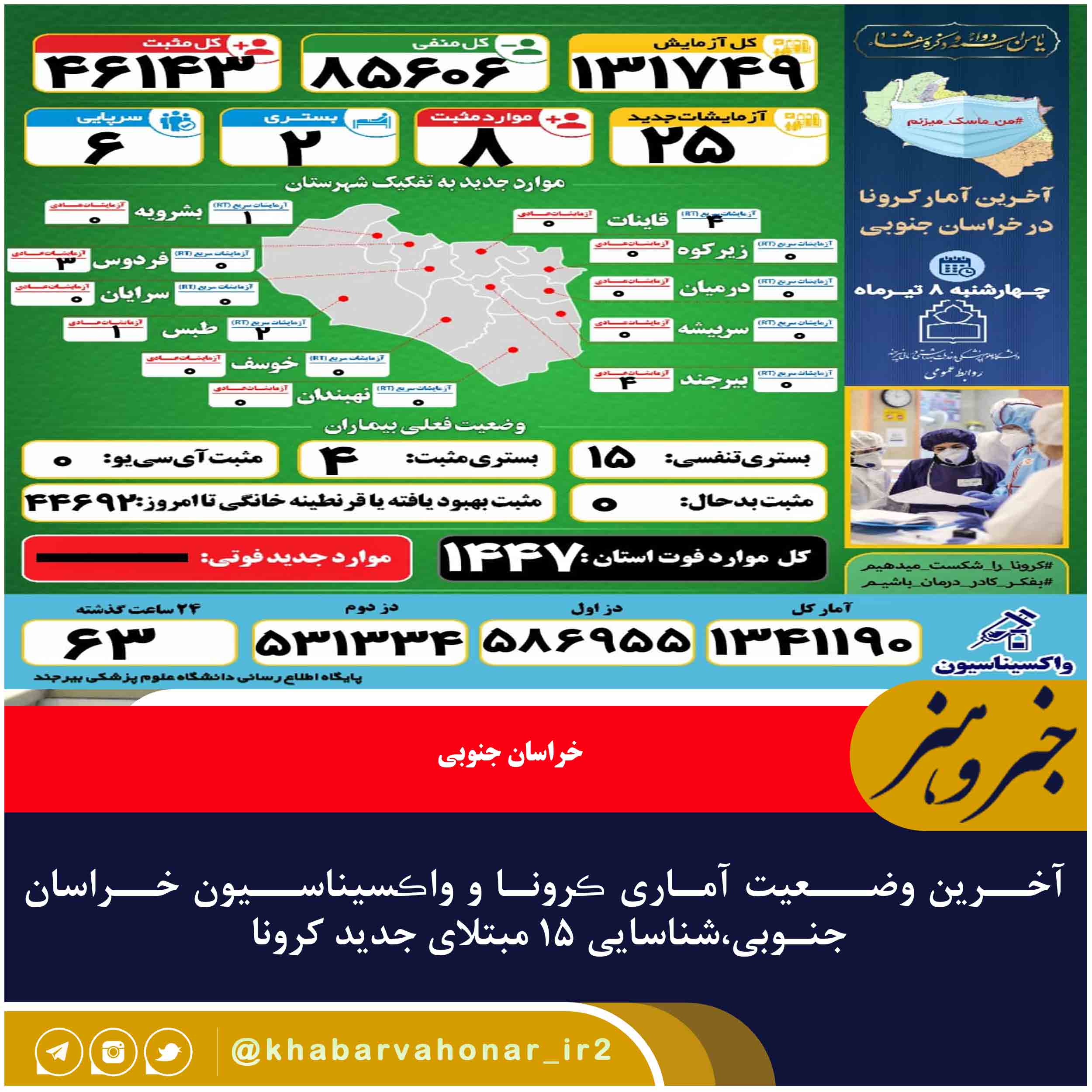?از ۱۵ مورد مثبت جدید ۱ مورد مربوط به شهرستان بشرویه، ۴ مورد در شهرستان بیرجند، ۳ مورد در طبس، ۳ مورد فردوس و ۴ مورد در شهرستان قائنات شناسایی شدند.