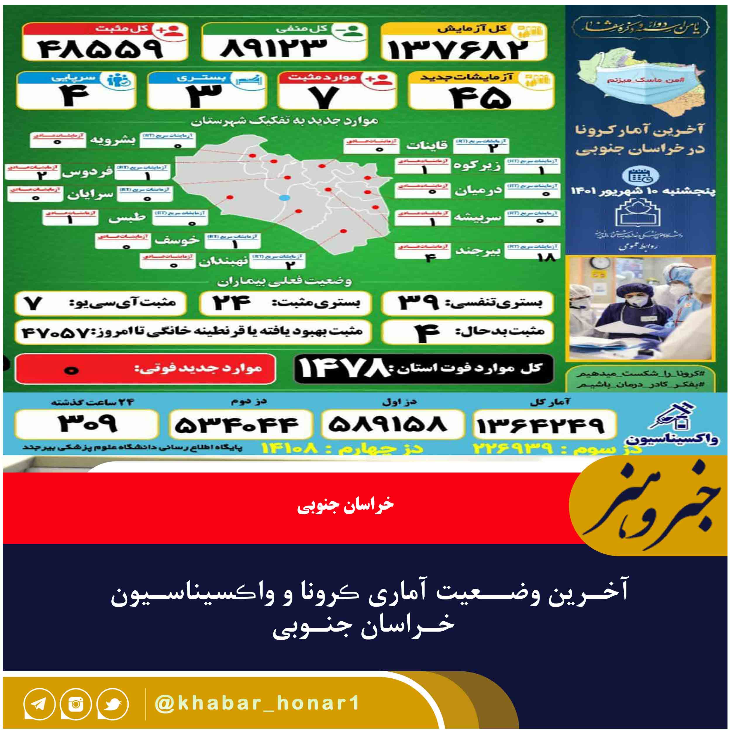 آخـرین وضــعیت آماری ڪرونا و واڪسیناسـیون خـراسان جنـوبی