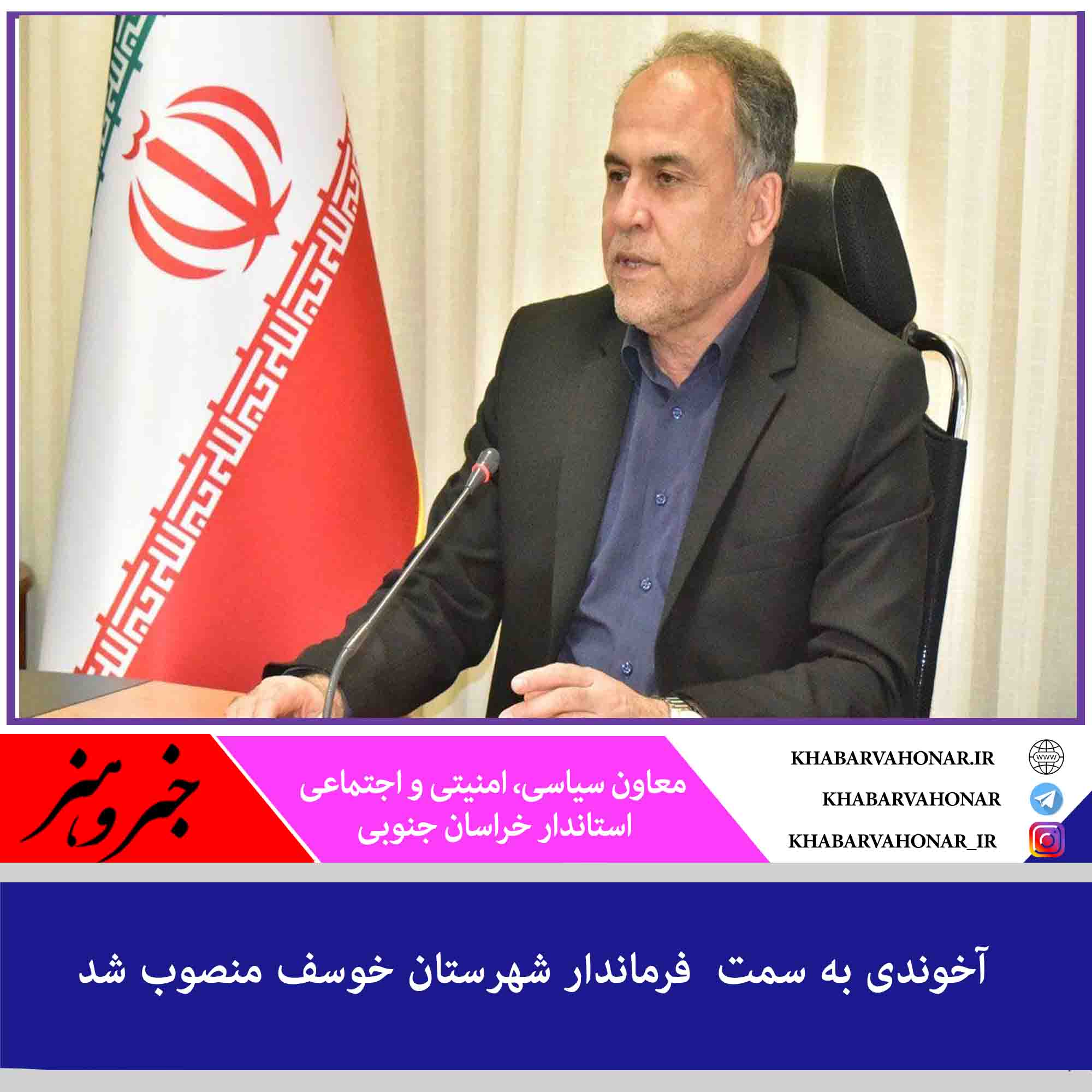 ?معاون سیاسی، امنیتی و اجتماعی استاندار خراسان جنوبی گفت: با حکم وزیر کشور، محمدعلی آخوندی به سمت فرماندار شهرستان خوسف منصوب شد.