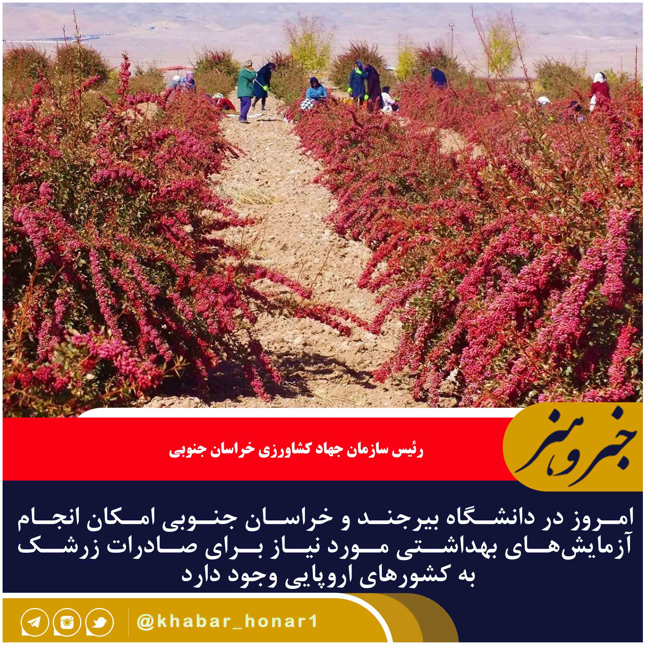 رئیس سازمان جهاد کشاورزی خراسان جنوبی گفت: امروز در دانشگاه بیرجند و خراسان جنوبی امکان انجام آزمایش‌های بهداشتی مورد نیاز برای صادرات زرشک به کشورهای اروپایی وجود دارد.