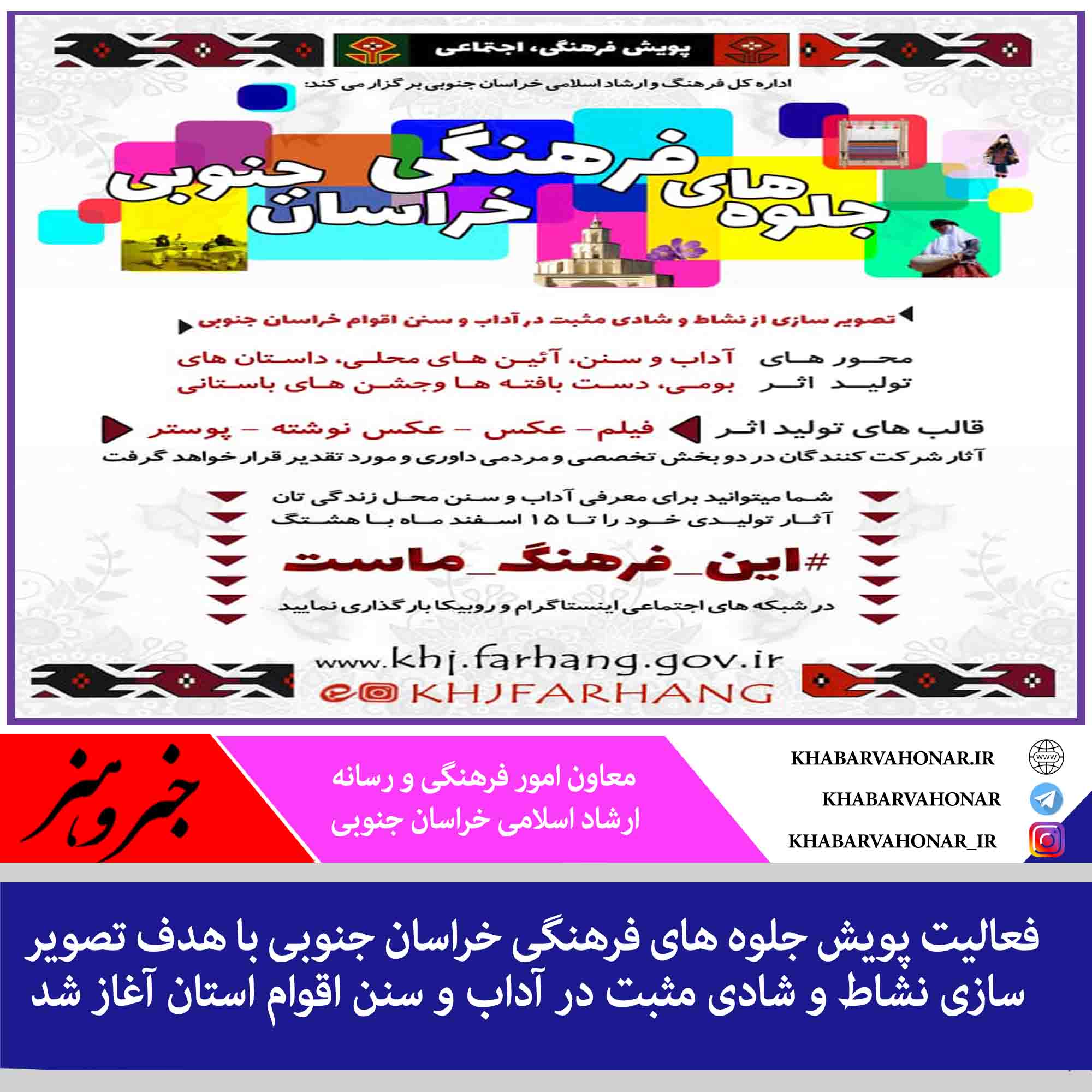 ? معاون امور فرهنگی و رسانه اداره کل فرهنگ و ارشاد اسلامی خراسان جنوبی گفت: فعالیت پویش جلوه های فرهنگی خراسان جنوبی با هدف تصویر سازی نشاط و شادی مثبت در آداب و سنن اقوام استان آغاز شد.