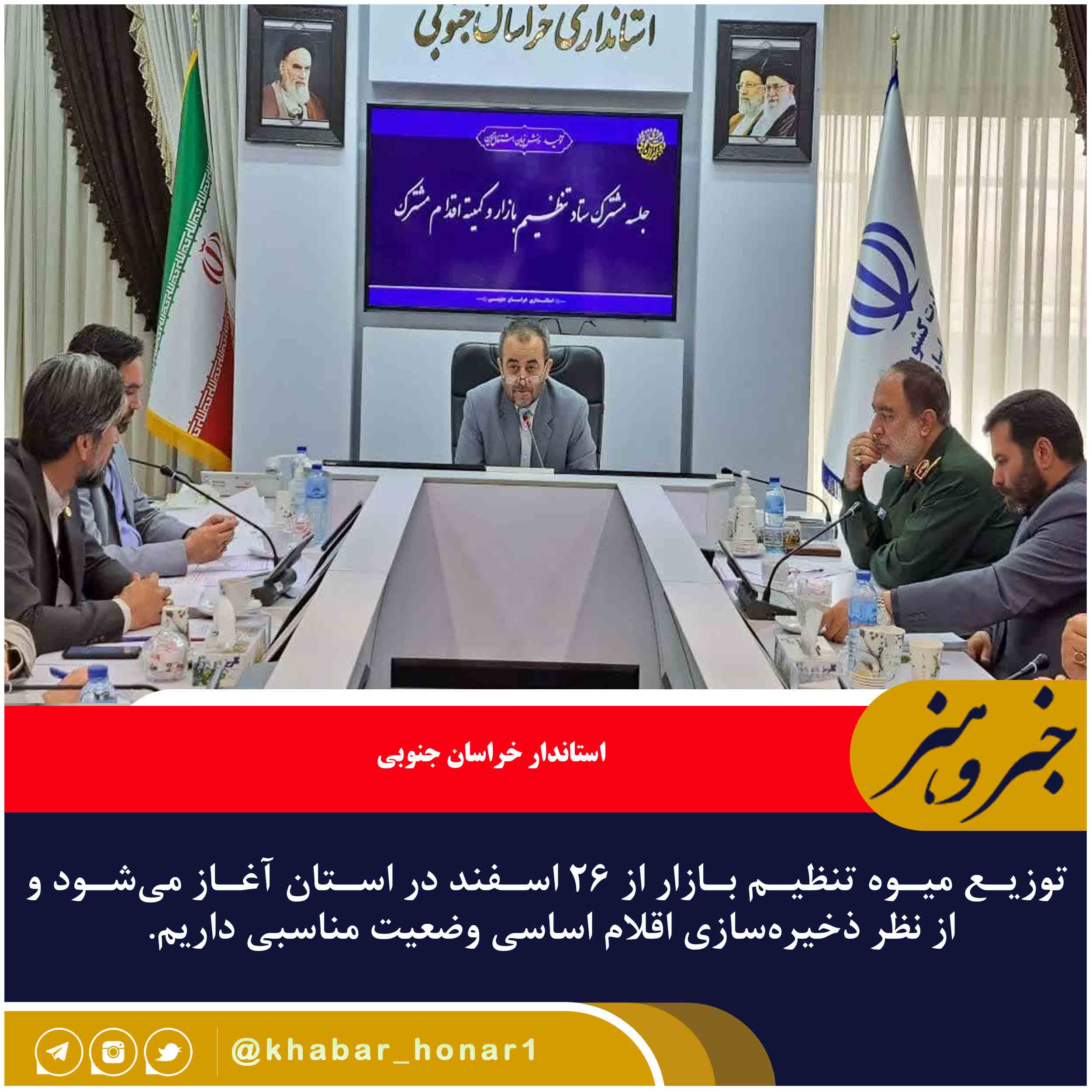 استاندار خراسان جنوبی گفت: توزیع میوه تنظیم بازار از ۲۶ اسفند در استان آغاز میشود و از نظر ذخیرهسازی اقلام اساسی وضعیت مناسبی داریم.