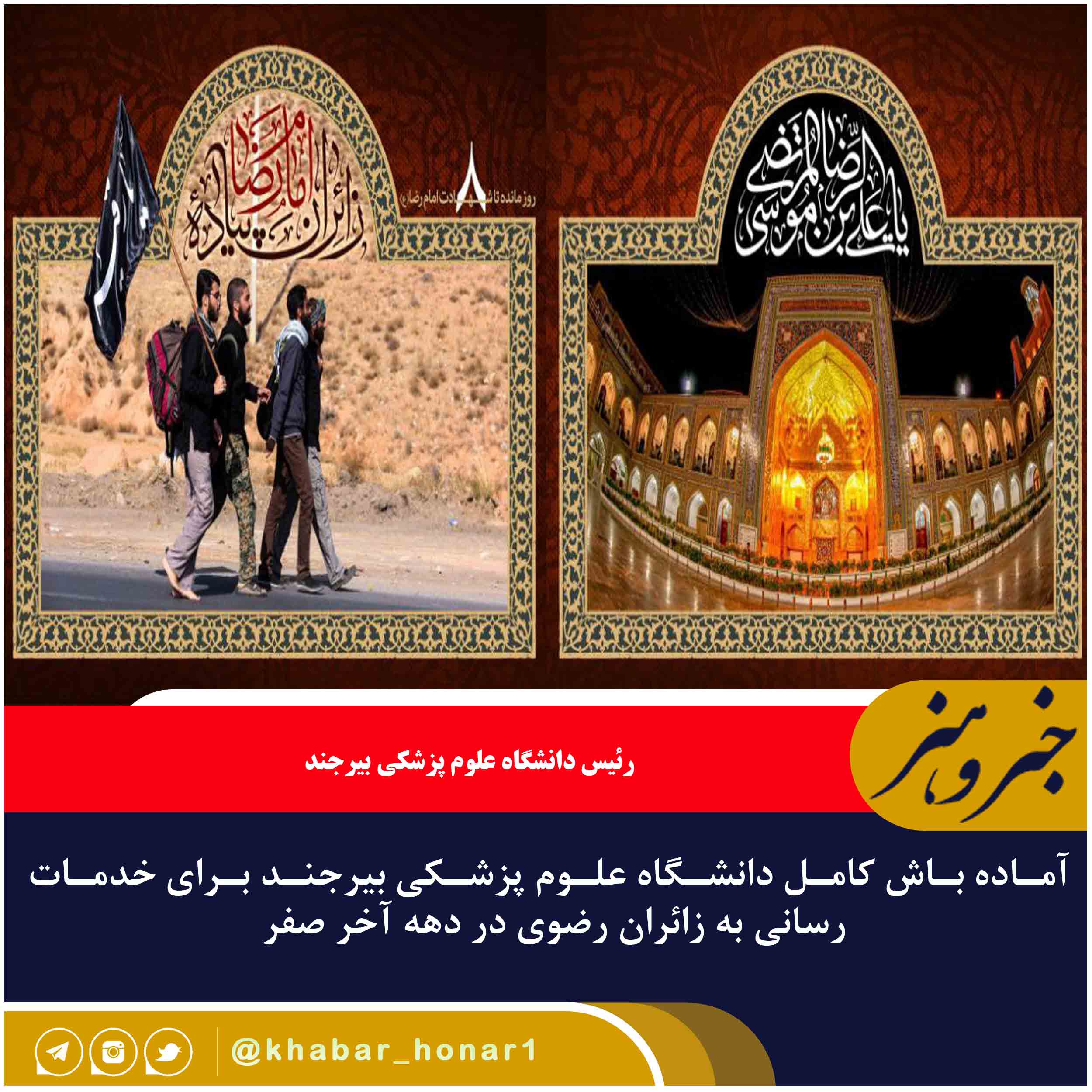 رئیس دانشگاه علوم پزشکی بیرجند با بیان اینکه در دهه پایانی صفر خیل عظیمی از عاشقان و محبین اهل بیت(ع) برای گرامیداشت یکی از بزرگترین و عظیم ترین مناسبت های مذهبی عازم بارگاه منور رضوی می شوند گفت: همۀ مراکز بهداشتی و درمانی تحت پوشش این دانشگاه در دهۀ پایانی ماه صفر برای خدمترسانی به زائرین حضرت علیبنموسیالرضا (ع) و کاروانهای پیاده در آمادهباش کامل هستند.