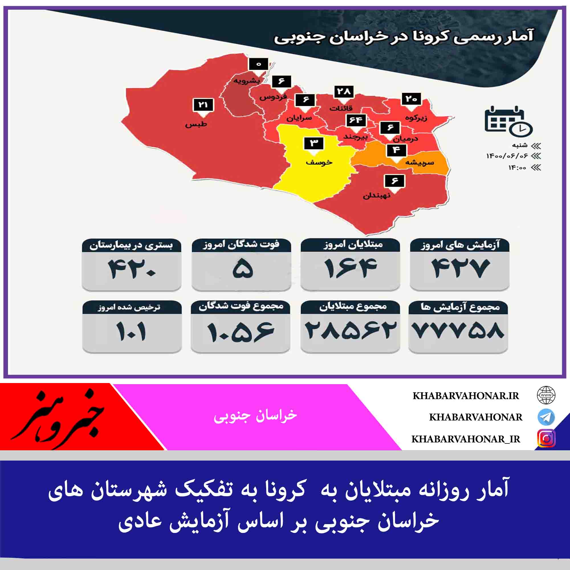 آمار روزانه مبتلایان به کرونا به تفکیک شهرستان های خراسان جنوبی بر اساس آزمایش عادی