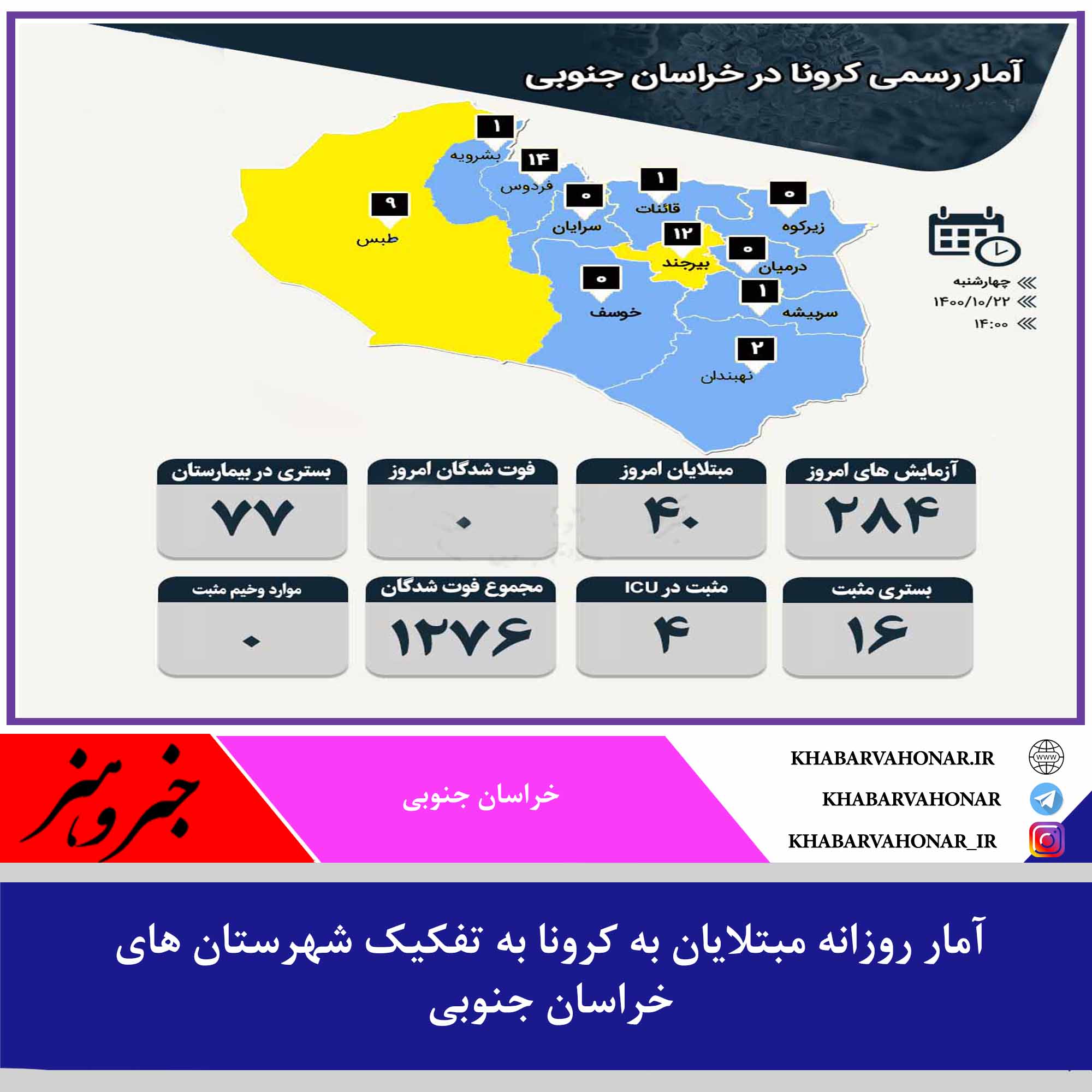 آمار روزانه مبتلایان به کرونا به تفکیک شهرستان های خراسان جنوبی