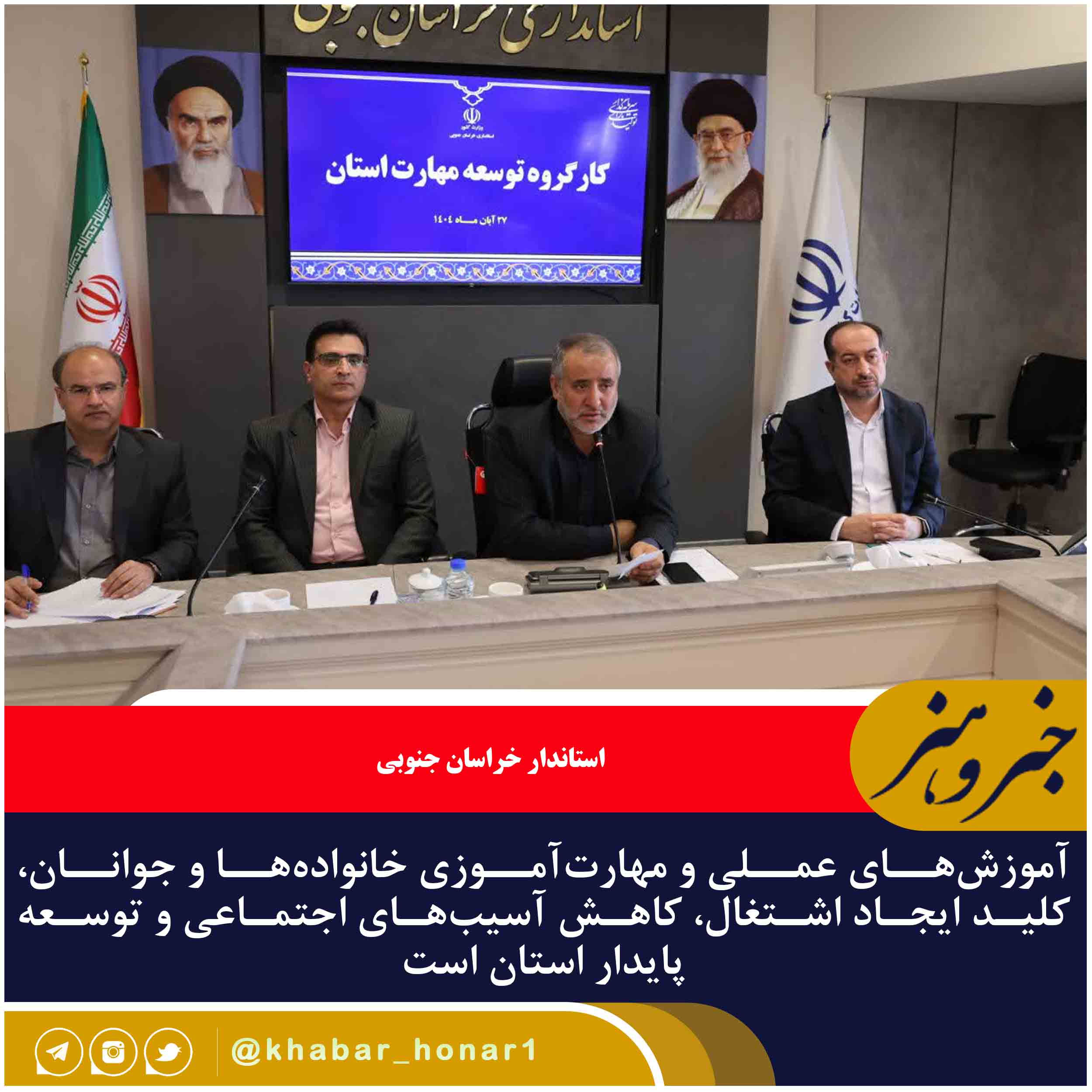 استاندار خراسان جنوبی تأکید کرد: آموزش‌های عملی و مهارت‌آموزی خانواده‌ها و جوانان، کلید ایجاد اشتغال، کاهش آسیب‌های اجتماعی و توسعه پایدار استان است.