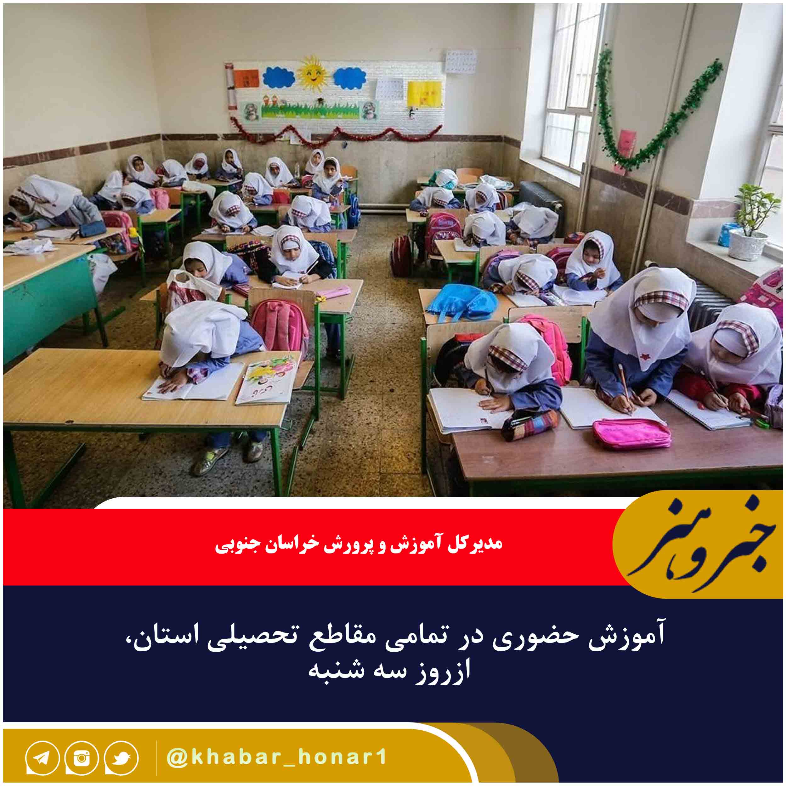 ?مدیرکل آموزش و پرورش خراسان جنوبی گفت: آموزش حضوری مدارس استان در تمامی مقاطع تحصیلی از ساعت ۷:۳۰ صبح روز سه شنبه چهارم بهمن ماه آغاز می شود.