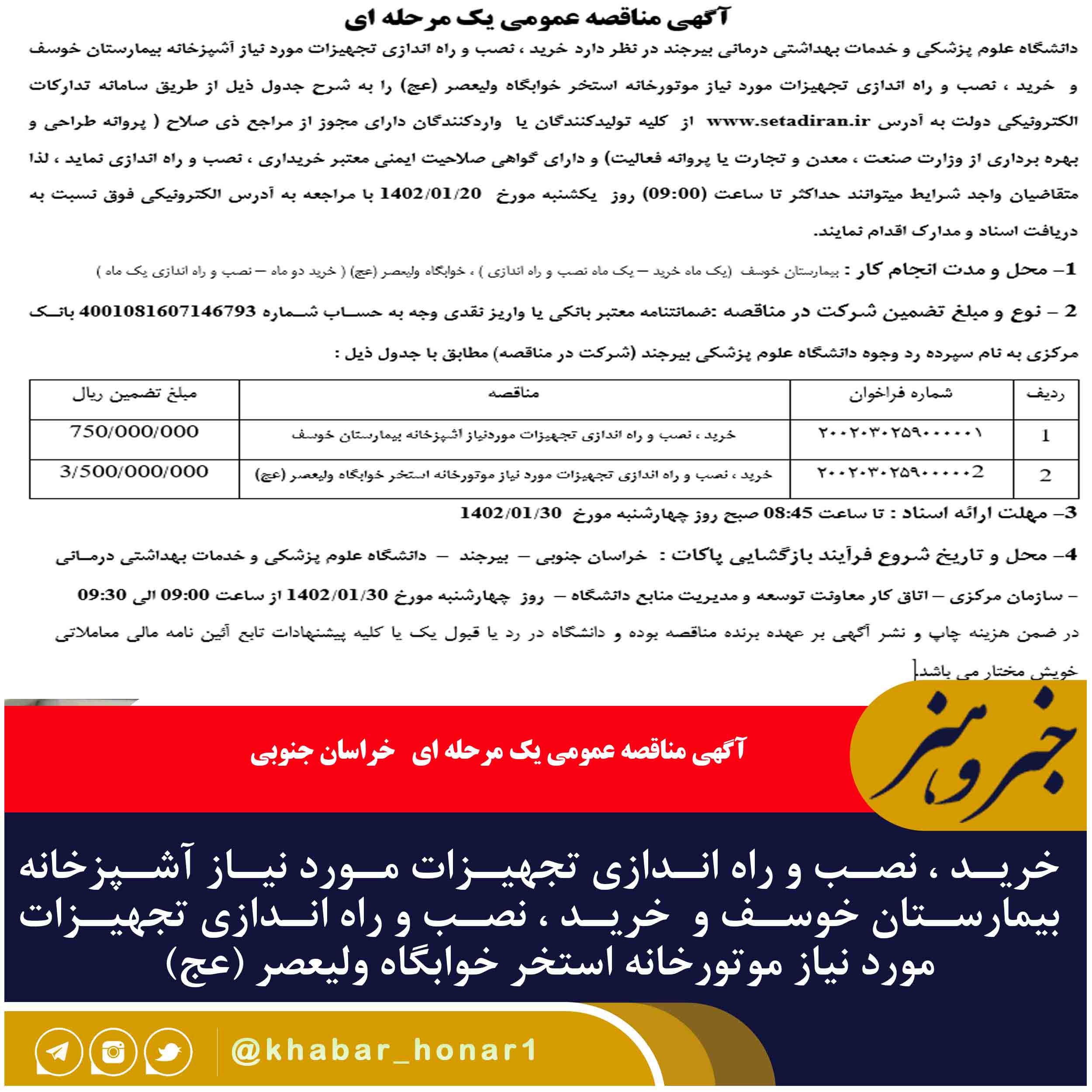 دانشگاه علوم پزشکی و خدمات بهداشتی درمانی بیرجند در نظر دارد خرید ، نصب و راه اندازی تجهیزات مورد نیاز آشپزخانه بیمارستان خوسف و  خرید ، نصب و راه اندازی تجهیزات مورد نیاز موتورخانه استخر خوابگاه ولیعصر (عج) را به شرح جدول ذیل از طریق سامانه تدارکات الکترونیکی دولت به آدرس www.setadiran.ir  از  کلیه تولیدکنندگان یا  واردکنندگان دارای مجوز از مراجع ذی صلاح ( پروانه طراحی و بهره برداری از وزارت صنعت ، معدن و تجارت یا پروانه فعالیت) و دارای گواهی صلاحیت ایمنی معتبر خریداری ، نصب و راه اندازی نماید ، لذا متقاضیان واجد شرایط میتوانند حداکثر تا ساعت (۰۹:۰۰) روز  یکشنبه مورخ  ۲۰/۰۱/۱۴۰۲ با مراجعه به آدرس الکترونیکی فوق نسبت به دریافت اسناد و مدارک اقدام نمایند.