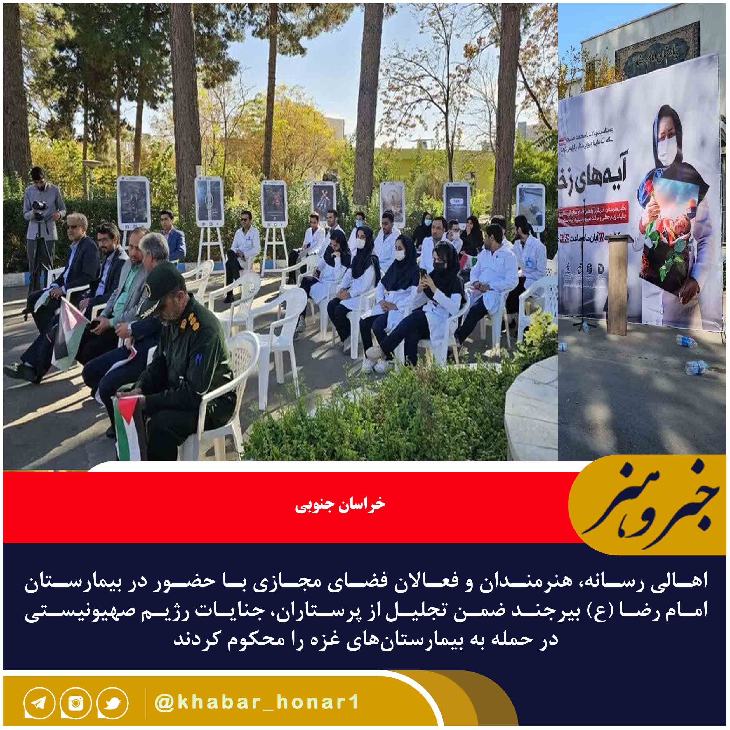 جمعی از اهالی رسانه، هنرمندان و فعالان فضای مجازی با حضور در بیمارستان امام رضا (ع) بیرجند ضمن تجلیل از پرستاران، جنایات رژیم صهیونیستی در حمله به بیمارستانهای غزه را محکوم کردند.