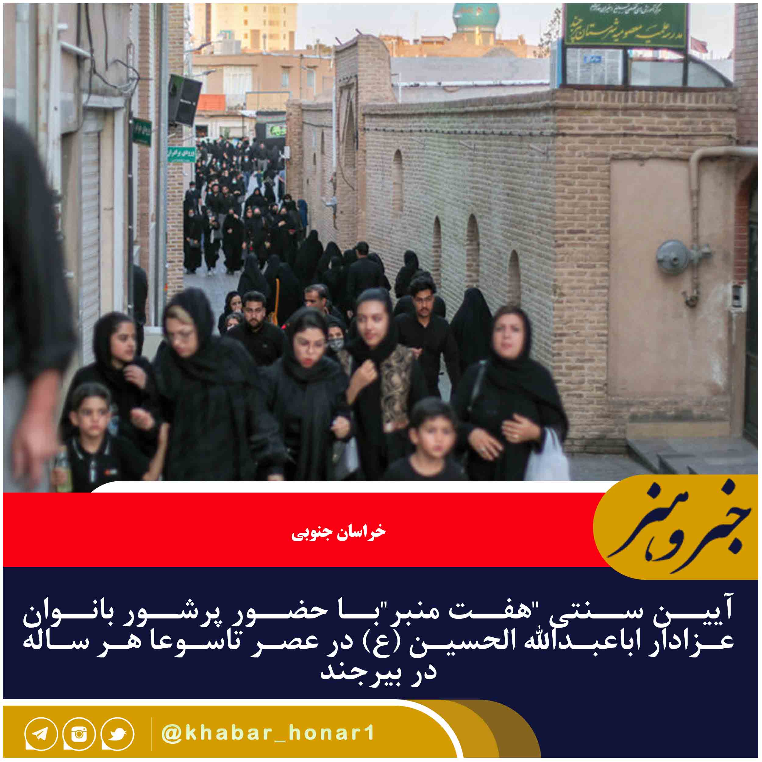 آیین سنتی “هفت منبر” در بیرجند که از قدمت زیادی برخوردار است محرم هر سال با حضور پرشور بانوان عزادار اباعبدالله الحسین (ع) در عصر تاسوعا برگزار میشود.